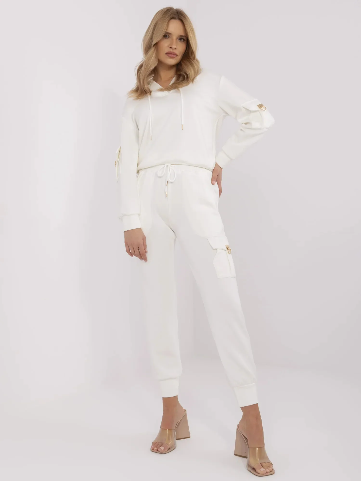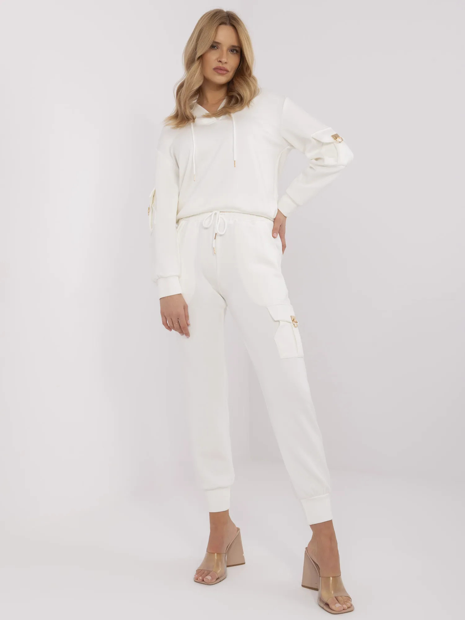 Modelka má na sobě velikost S/M. Rozměry modelky: výška 175 cm, prsa 90 cm, pas 66 cm, boky 94 cm. Rozměry halenky ve velikosti S/M měřené na plocho: šířka v podpaží - 51 cm délka rukávu - 55 cm (od švu), šířka v bocích - 42 cm, celková délka - 57 cm. Rozměry kalhot ve velikosti S/M šířka v pase - 33 cm (naplocho), šířka v pase - 55 cm (od švu), výška v pase - 29 cm, šířka v bocích - 50 cm, celková délka - 95 cm.Velikost Alt.VýškaObvod hrudníkuVnější délka rukávuVnější délka rukávuM/L38/40162-17486-9161-6351-53S/M36/38160-17282-8659-6149-51