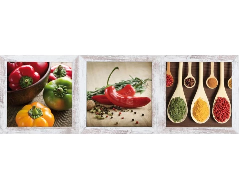Dekorativní rámovaná sada 3 obrazů na zeď, které vytvoří dokonalý celek vedle sebe nebo nad sebou. Motiv koření se hodí do kuchyně nebo jídelny.