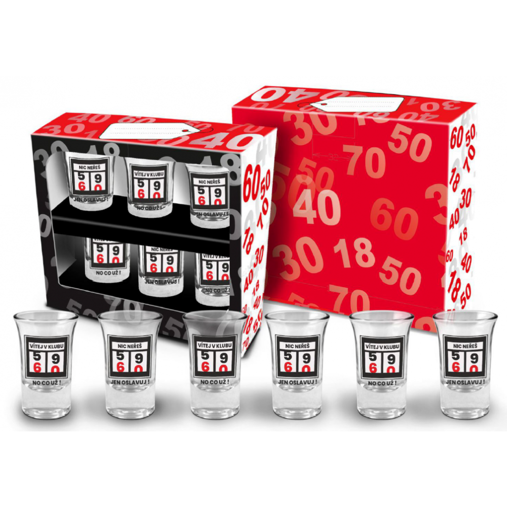 Sada panáků 60 narozeniny Panák sklo 0,35 cl potisk+krabička. Sada narozeninových panáků v dárkové krabičce ke 60tým narozeninám. S originálním potiskem, kde se přelamují poslední dny 59tých narozenin ke 60tým.