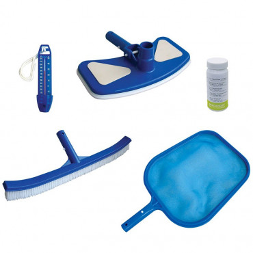 Tato praktická sada obsahuje vše, co potřebujete pro základní péči o bazén. Najdete v ní klasický ruční bazénový vysavač, síťku na nečistoty, teploměr, tester vody (např. testovací proužky nebo štítky) a držák na příslušenství. Vhodné pro menší i střední bazény – ideální volba pro každého, kdo chce udržet vodu čistou a bezpečnou.