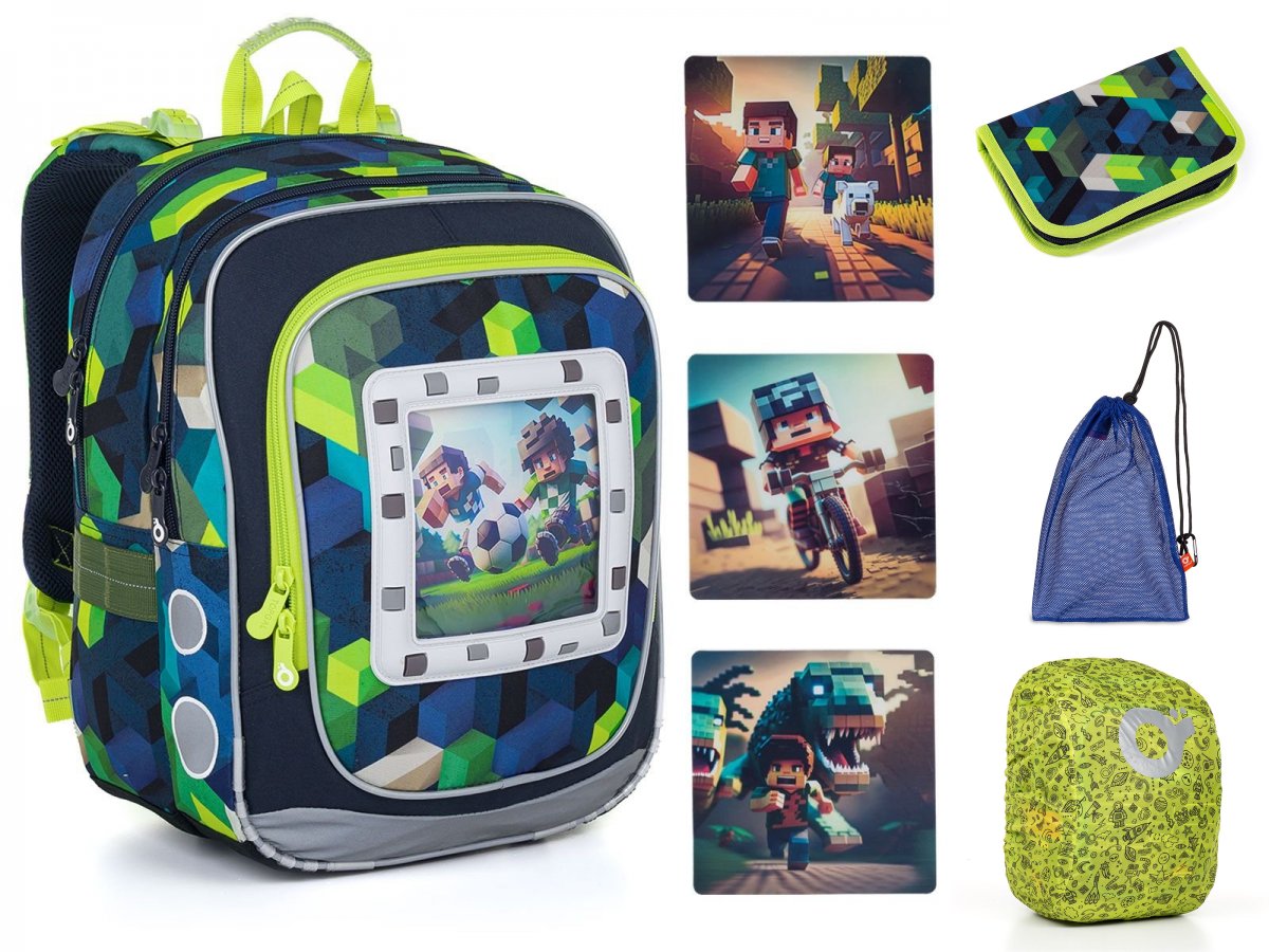 Model ENDY neváží ani kilogram, proto je ideální pro kluky s výškou od 110 cm do první až třetí třídy ZŠ. Součástí batohu jsou čtyři obrázky se zvířecím a sportovním motivem v Minecraft stylu. Batoh má dvě objemné hlavní komory. Do nejširší zadní komory doporučujeme dát nejtěžší učebnice nebo desky na sešity. Přední komora je o něco užší, a je v ní umístěna malá síťová kapsa na zip a jmenovka. Přední hluboká kapsa pojme např. penál PENN 24015 ve stejném designu nebo krabičku na svačinu. Do bočních kapes se vejdou zdravé lahve ZIVA o objemu 0,5 litru. Hlavní charakteristika: váží pouhých 880 gramů pevná lisovaná záda dvě komory a jedna hluboká přední kapsa výškově nastavitelná hrudní přezka nastavitelné ramenní popruhy poutka pro bederní pás TOP 24021 a TOP 24022 magnetky na koncích ramenních popruhů (pro snazší uchycení vlajících konců) reflexní prvky: na čele a bocích batohu, na ramenních popruzích zátěr proti dešti pevné, nepropustné dno z materiálu TOPDURA batoh byl testován v ITC Zlín odnímatelná karabina na klíče poutko na zavěšení batohu na lavici poutko na přenášení batohu v ruce