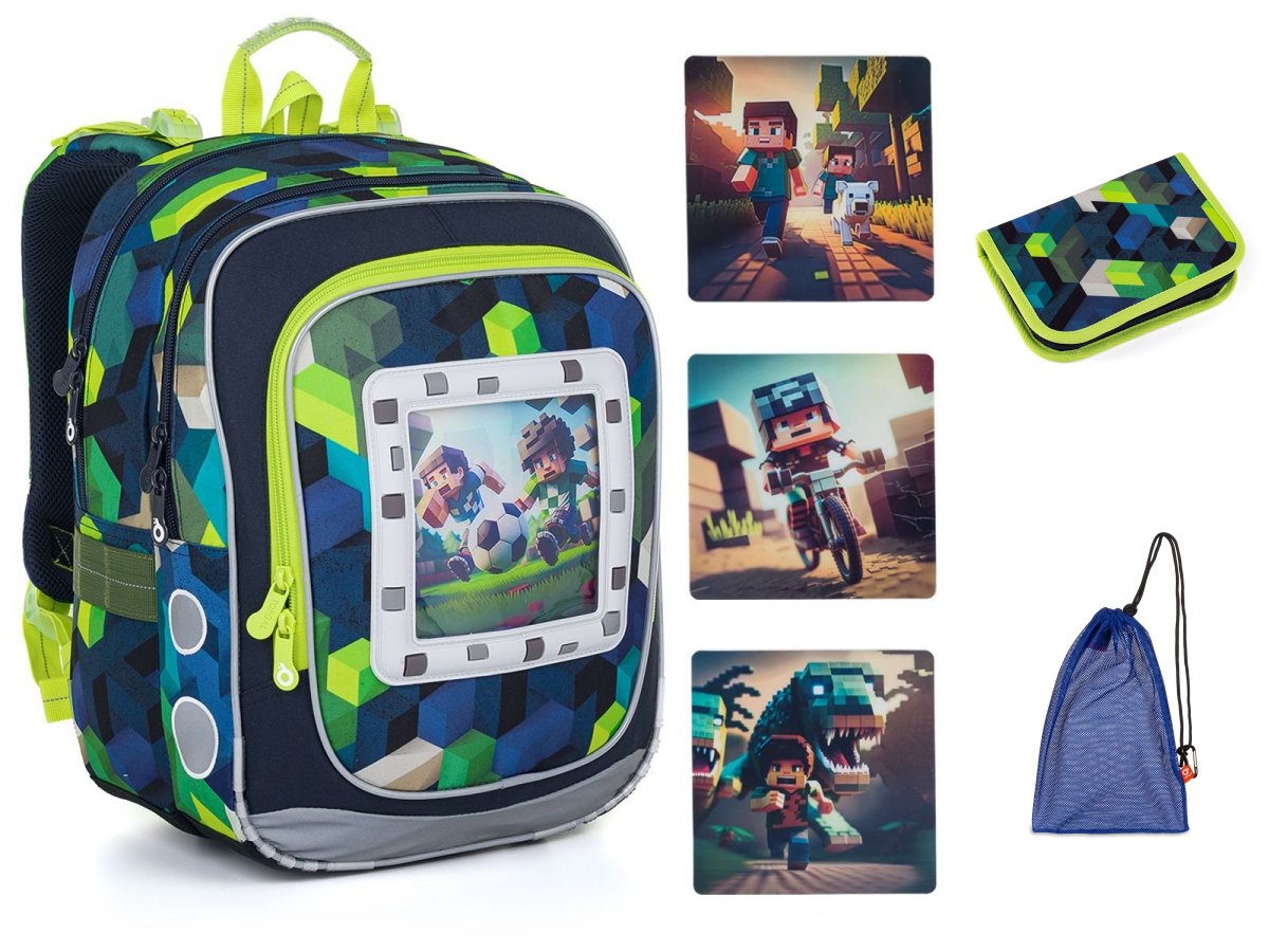 Model ENDY neváží ani kilogram, proto je ideální pro kluky s výškou od 110 cm do první až třetí třídy ZŠ. Součástí batohu jsou čtyři obrázky se zvířecím a sportovním motivem v Minecraft stylu. Batoh má dvě objemné hlavní komory. Do nejširší zadní komory doporučujeme dát nejtěžší učebnice nebo desky na sešity. Přední komora je o něco užší, a je v ní umístěna malá síťová kapsa na zip a jmenovka. Přední hluboká kapsa pojme např. penál PENN 24015 ve stejném designu nebo krabičku na svačinu. Do bočních kapes se vejdou zdravé lahve ZIVA o objemu 0,5 litru. Hlavní charakteristika: váží pouhých 880 gramů pevná lisovaná záda dvě komory a jedna hluboká přední kapsa výškově nastavitelná hrudní přezka nastavitelné ramenní popruhy poutka pro bederní pás TOP 24021 a TOP 24022 magnetky na koncích ramenních popruhů (pro snazší uchycení vlajících konců) reflexní prvky: na čele a bocích batohu, na ramenních popruzích zátěr proti dešti pevné, nepropustné dno z materiálu TOPDURA batoh byl testován v ITC Zlín odnímatelná karabina na klíče poutko na zavěšení batohu na lavici poutko na přenášení batohu v ruce