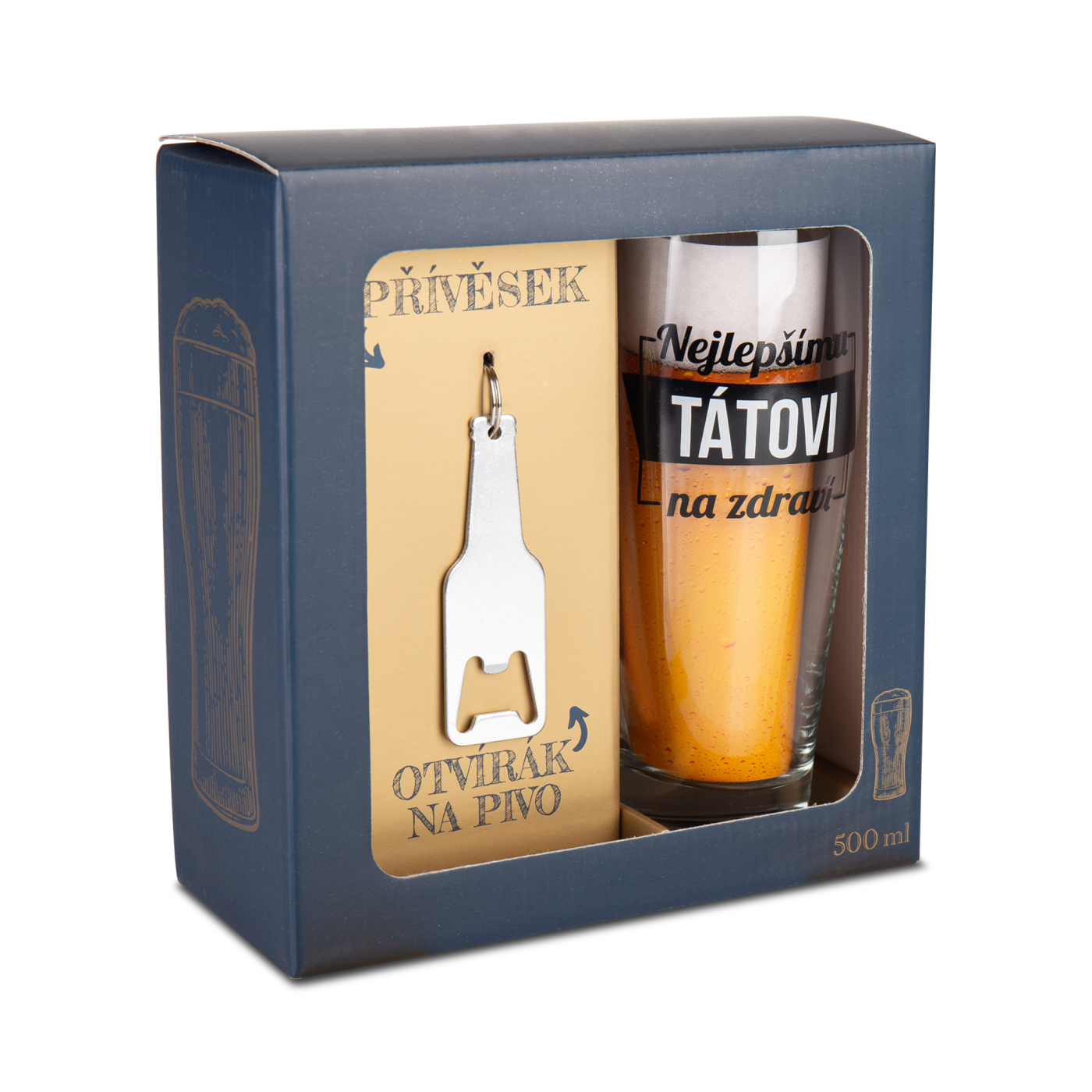 Originální sada obsahuje půllitr a kovový otvírák na pivo, který je zároveň klíčenkou.