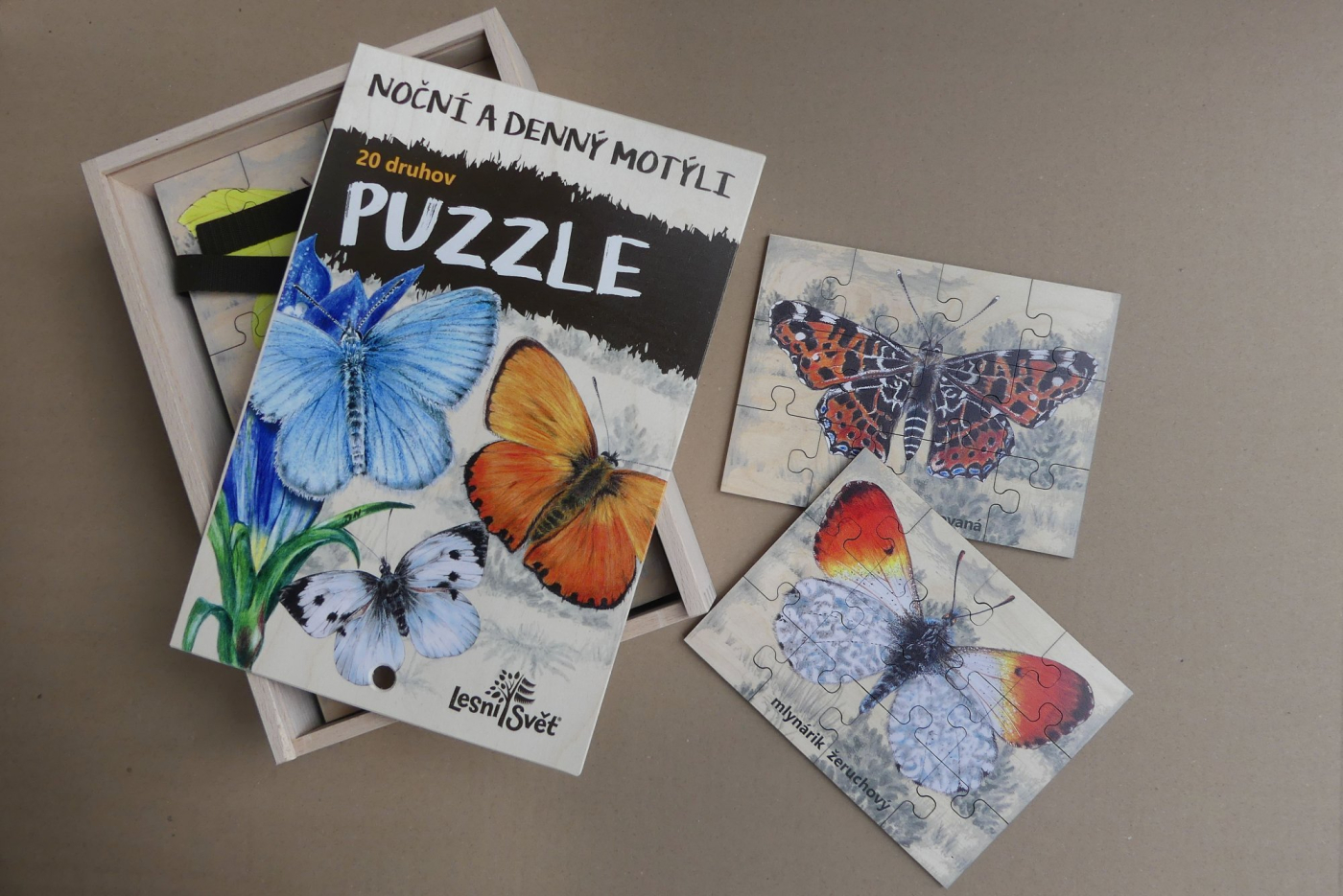 Puzzle vyrábajú v našej dielni české ruky z kvalitného českého certifikovaného dreva. Balenie obsahuje 20 edukačných skladačiek. Rozmery karty sú 15 cm × 20 cm. Balené v drevenej škatuľke z masívu s vysúvacím vekom: 32 cm × 6 cm × 22 cm. Autori kresieb sú českí ilustrátori, obrázky sú chránené autorskými právami. Drevené puzzle zábavnou a hravou formou zoznamuje deti aj dospelých s prírodou. Všetky karty obsahujú vernú ilustráciu podľa vybranej témy. DRUHY MOTÝĽOV: žltáčik rešetliakový, pestroň vlkovcový, nabôčka zubatokrídla, mníška veľkohlavá, modráčik obyčajný, stužkavec dubový, dúhovec menší, mlynárik žeruchový, babôčka pŕhľavová, babôčka sieťkovaná, vidlochvost ovocný, babôčka bodliaková, vidlochvost feniklový, babôčka osiková, babôčka pávooká, dúhovec väčší, babôčka admirálska, ohniváčik zlatobyľový, obaľovač zelený, mlynárik kapustový. Lesný svet = značka s ekologickým certifikátom udržateľného hospodárstva PEFC. Všetky produkty sú vyrobené s ohľadom na životné prostredie