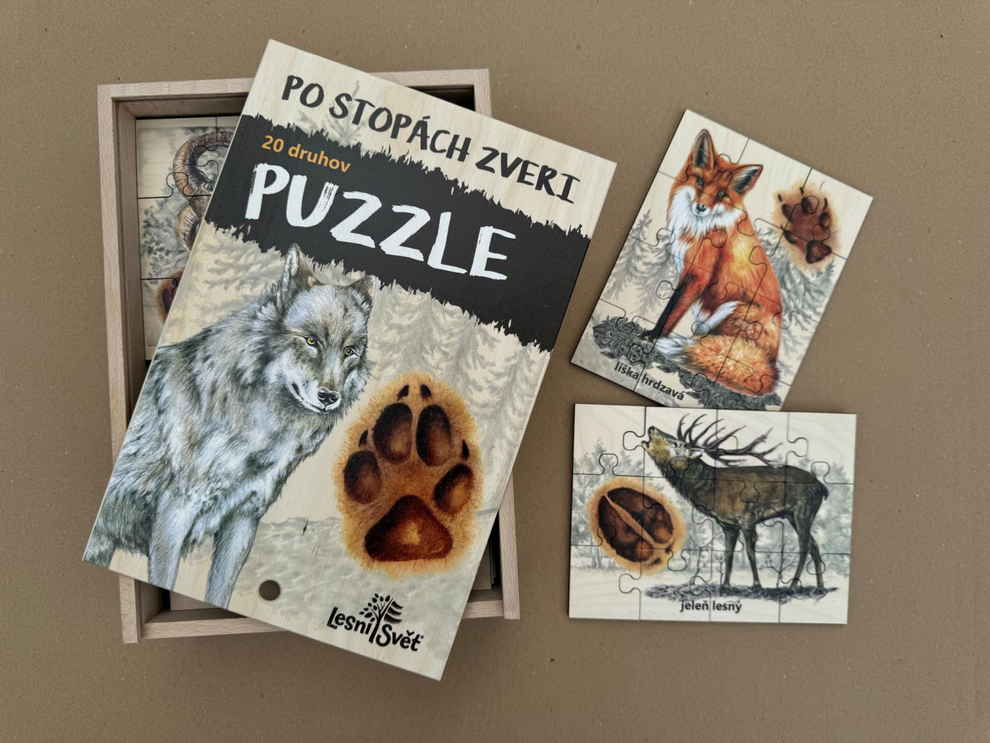 Puzzle vyrábajú v našej dielni české ruky z kvalitného českého certifikovaného dreva. Balenie obsahuje 20 edukačných skladačiek. Balené v drevenej škatuľke z masívu s vysúvacím vekom: 32 cm × 6 cm × 22 cm. Autori kresieb sú českí ilustrátori, obrázky sú chránené autorskými právami. Drevené puzzle zábavnou a hravou formou zoznamuje deti aj dospelých s prírodou. Všetky karty obsahujú vernú ilustráciu podľa vybranej témy. DRUHY CICAVCOV: zajac poľný, muflón, zubor európsky, líška hrdzavá, medveď hnedý, plch sivý, ryšavka žltohrdlá, kuna lesná, jazvec lesný, veverica obyčajná, rys ostrovid, jež tmavý, diviak lesný, bobor európsky, daniel škvrnitý, vlk dravý, jeleň lesný, vydra riečna, los mokraďový, srnec lesný. Lesný svet = značka s ekologickým certifikátom udržateľného hospodárstva PEFC. Všetky produkty sú vyrobené s ohľadom na životné prostredie.