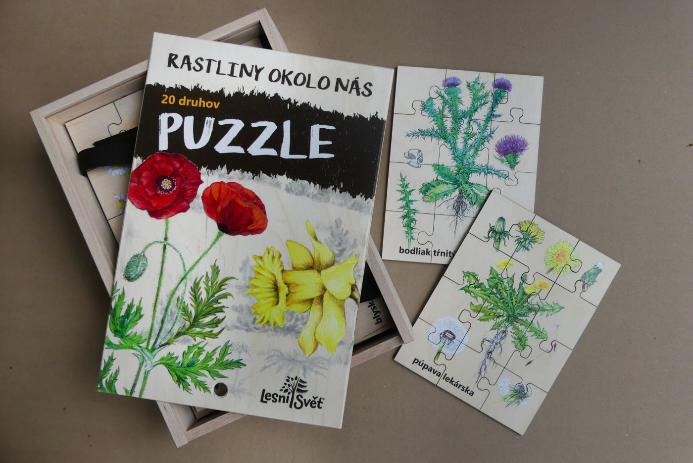 Puzzle vyrábajú v našej dielni české ruky z kvalitného českého certifikovaného dreva. Balenie obsahuje 20 edukačných skladačiek. Rozmery karty sú 15 cm × 20 cm. Balené v drevenej škatuľke z masívu s vysúvacím vekom: 32 cm × 6 cm × 22 cm. Autori kresieb sú českí ilustrátori, obrázky sú chránené autorskými právami. Drevené puzzle zábavnou a hravou formou zoznamuje deti aj dospelých s prírodou. Všetky karty obsahujú vernú ilustráciu podľa vybranej témy. DRUHY RASTLÍN: podbeľ liečivý, kostihoj lekársky, prvosienka jarná, mak vlčí, veternica hájna, pľúcnik lekársky, narcis žltý, margaréta biela, bodliak obyčajný, záružlie močiarne, rumanček kamilkový, hluchavka biela, jahoda obyčajná, skorocel kopijovitý, čakanka obyčajná, náprstník červený, blyskáč cibuľkatý, kyslička obyčajná, bleduľa jarná, púpava lekárska. Lesný svet = značka s ekologickým certifikátom udržateľného hospodárstva PEFC. Všetky produkty sú vyrobené s ohľadom na životné prostredie.