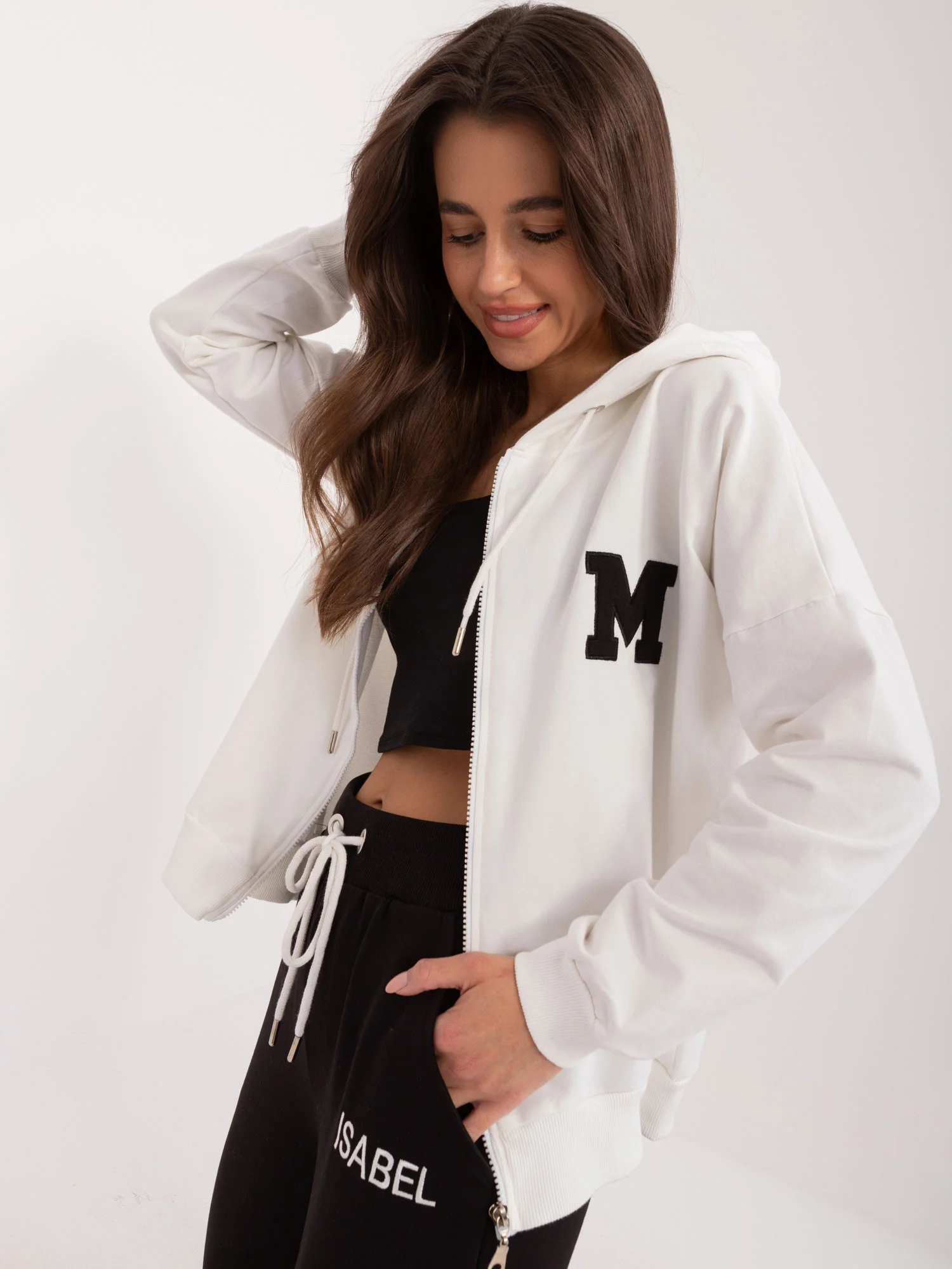 Modelka má na sobě velikost S/M. Rozměry modelky: výška 172 cm, prsa 88 cm, pas 63 cm, boky 92 cm. Rozměry soupravy ve velikosti S/M měřené na plocho: šířka halenky v podpaží - 62 cm, délka rukávů - 42 cm (od švu), obvod v bocích - 48 cm, délka halenky - 59 cm, šířka kalhot v pase - 35 cm, obvod v bocích - 46 cm výška stavu - 30 cm, délka kalhot - 95 cm.Velikost alt.VýškaObvod hrudníkuVnější délka rukávuVnější délka rukávuS/M36/38160-17282-8659-6149-51L/XL40/42164-17891-9663-6553-55