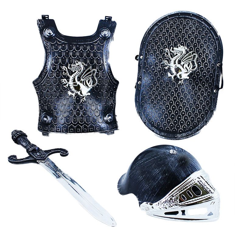 Sada rytířská s přilbou Popadni meč, nasaď si ochranný štít, přilbu a vzhůru do rytířského boje! Tahle sada obsahuje stříbrný meč, ochranný štít s erbem draka, helmu s krytem a rytířskou vestu. Vše je vyrobeno z PVC. Meč je dlouhý cca 49 cm.