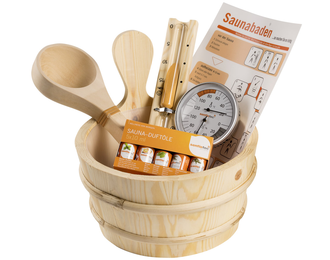Set sladěných doplňků do sauny. Vše, co potřebujete k saunování, je uspořádáno v jednom balení.
