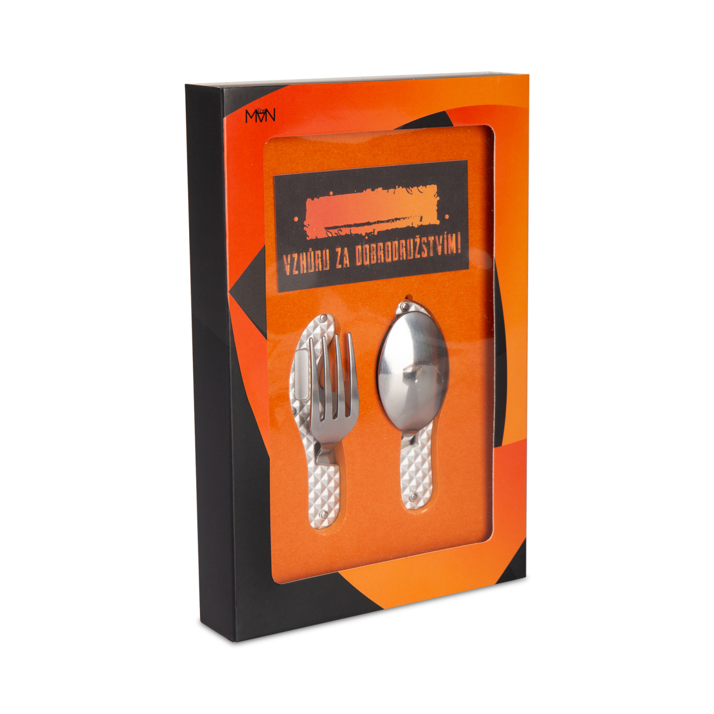 Sada skládací příbor obsahuje vidličku, nůž, lžíci a otvírák z nerezové oceli. Lze zaklapnout do sebe. Nevhodné pro mytí v myčce nádobí.