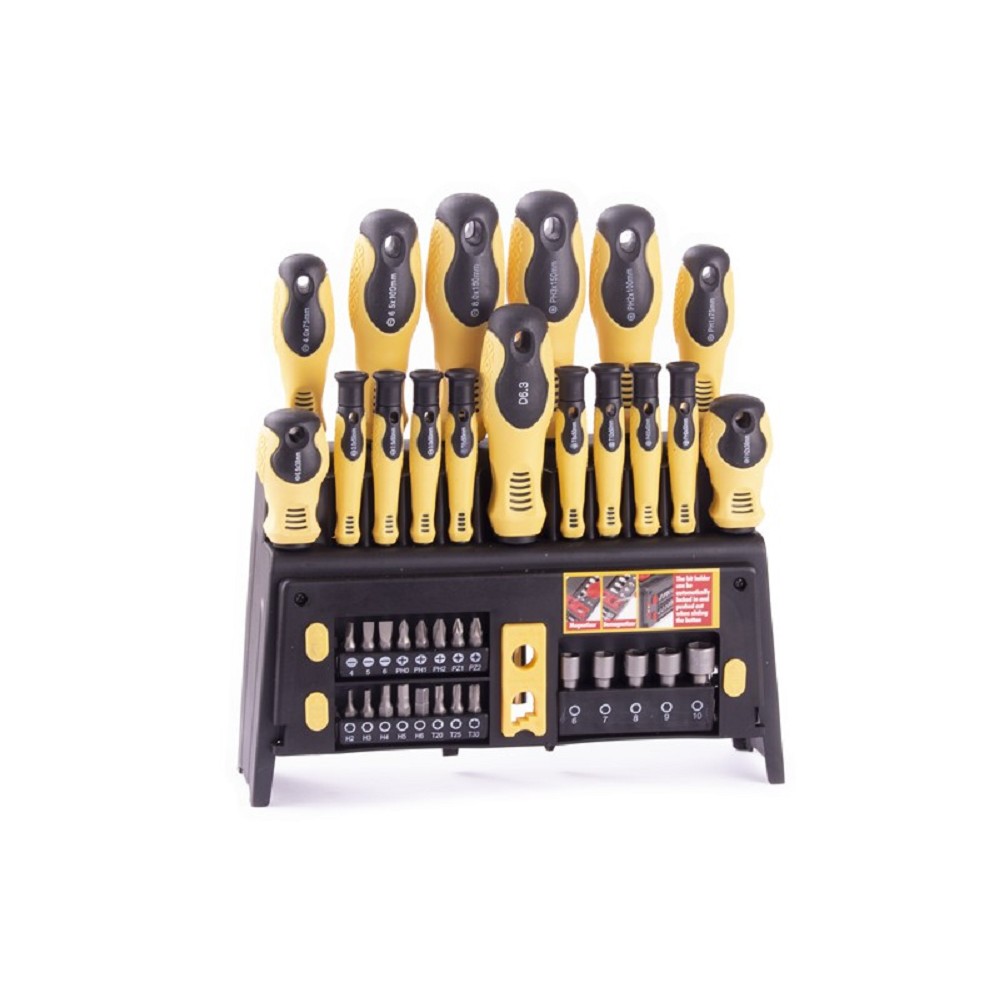Sada šroubováků 39 ks, ve stojanu 108824 Sada šroubováků 39 ks ve stojanu (kód 108824) je praktická a komplexní sada nářadí, která by neměla chybět v žádné dílně, garáži nebo domácnosti. Tato sada obsahuje široký výběr šroubováků různých typů a velikostí, což umožňuje použití pro různé účely. Vlastnosti: Počet kusů: 39 Typy šroubováků: ploché, křížové (PH), Pozidriv (PZ), Torx (TX), mikrošroubováky Materiál: kvalitní ocel (pravděpodobně chrom-vanadiová) Stojan: praktický stojan pro přehledné uložení a snadný přístup Rukojeť: ergonomicky tvarovaná pro pohodlné a bezpečné uchopení Výhody: Komplexní sada: obsahuje široký výběr šroubováků pro různé účely Kvalitní materiály: zajišťují dlouhou životnost a odolnost Praktický stojan: usnadňuje skladování a organizaci nářadí Ergonomické rukojeti: zajišťují pohodlnou práci Univerzální použití: vhodné pro kutily i profesionály Použití: Sada šroubováků je ideální pro: Montáž a demontáž nábytku Opravy elektroniky a spotřebičů Práce s dřevem a kovem A další drobné opravy a údržbu • sada obsahuje: • šroubováky ploché 4ks: 6.5x38, 5.5x75, 6.5x100, 8x150 • šroubováky PH 4ks: PH2x38, PH1x75, PH2x100, PH2x150 • mikrošroubováky 8ks: 2.0, 2.5, 3.0, PH00, PH0, T6, T8, T10 • bity 16ks 1/4: ploché 4, 5, 6, PH0, PH1, PH2, PZ1, PZ2, T20, T25, T30, H2, H3, H4, H5, H6 • nástrčné klíče 5ks: 6, 7, 8, 9, 10 mm • adaptér pro bity 1/4" šestihran • magentizovač / odmagnetizovač • stojan (možnost zavěšení na stěnu)