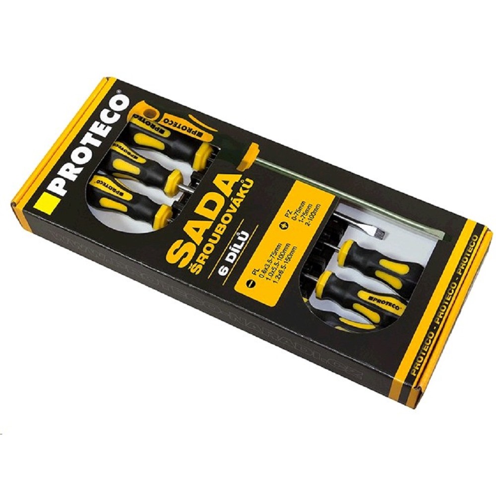 Sada šroubováků 6-dílná PL+PZ v krabici PROTECO 10.07-990-03 Sada šroubováků PL + PZ. Šestidílná sada obsahuje tři ploché a tři křížové šroubováky z vysoce kvalitní chrom-vanadiové oceli. Komfortní úchop šroubováku zajistí plastové rukojeti s pryžovými prvky. Sada obsahuje: Šroubováky PL 0.6 x 3.5 - 75 mm; 1.0 x 5.5 - 100 mm; 1.2 x 6.5 - 150 mmŠroubováky PZ 0 - 75 mm; 1 - 75 mm; 2 - 100 mm