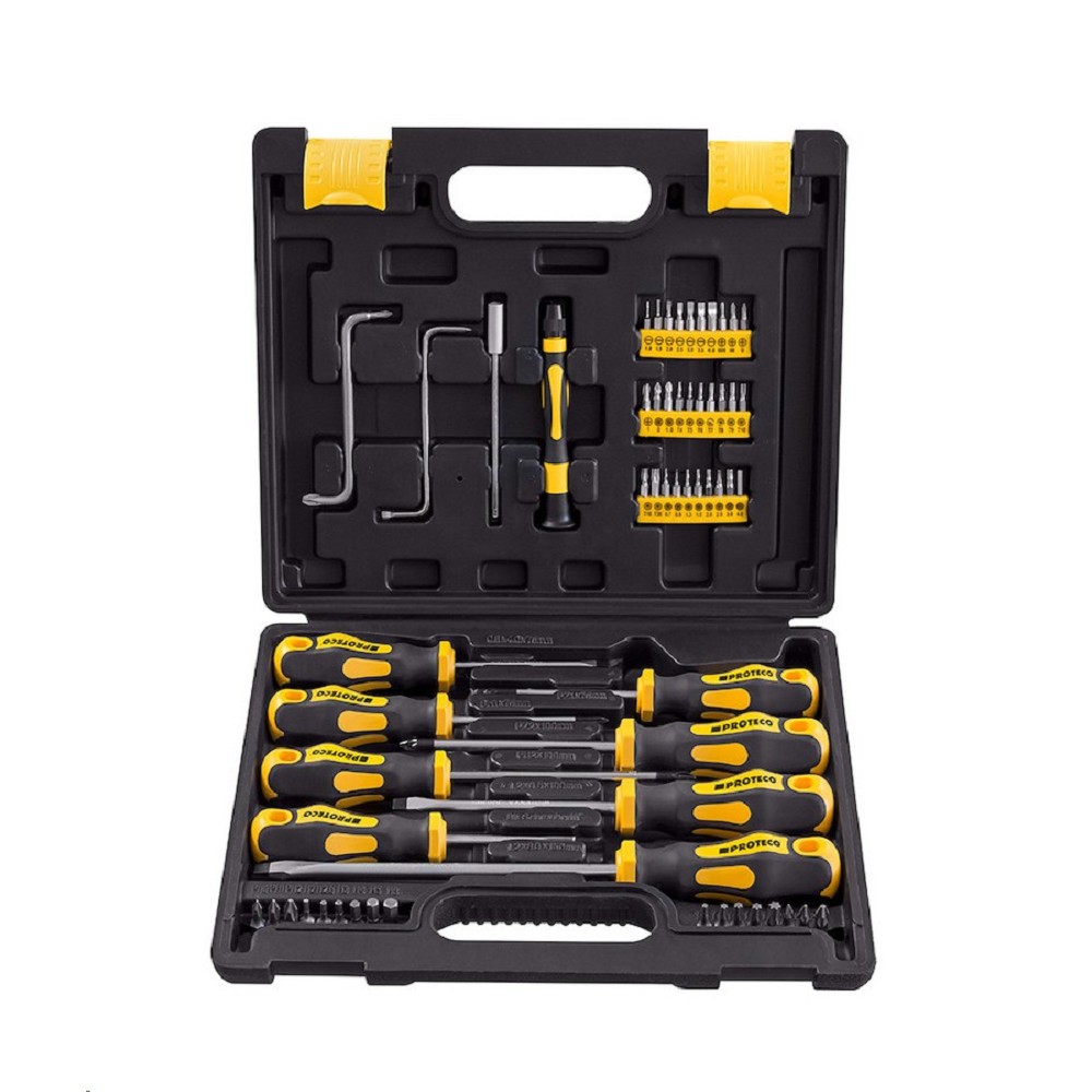 Sada šroubováků a bitů 60-dílná v kufru PROTECO 10.07-990-01 Sada šroubováků a bitů 60-dílná v kufru PROTECO je skvělým společníkem pro každodenní práci s různými typy šroubů. Tato kvalitní sada obsahuje široký výběr bitů a šroubováků, které ti umožní snadno a efektivně pracovat s různými druhy šroubů. Díky praktickému kufříku můžeš mít všechny nástroje pohromadě a vždy po ruce. Sada obsahuje: šroubováky: PL - 0,8x4,0 - 75mm PL - 1,2x6,5 - 100mm PL - 1,2x8,0 - 150mm PH - 1 - 75mm PH - 2 - 100mm PZ - 1 - 75mm PZ - 2 - 100mm držák bitů 17x bit 25mm 1/4": PH - 0, 1, 2 PZ - 0, 1, 2 TRX - 10, 15, 20, 25, 30 6HR - 2, 2.5, 3, 4, 5, 6 mm držák bitů pro jemnou mechaniku držák bitů 5/32" (4mm) x 115mm 30x bit 28mm 5/32": PL - 1.0, 1.5, 2.0, 2.5, 3.0, 3.5, 4.0 mm PH - 000, 00, 0, 1 PZ - 0, 1 TRX - 4, 5, 6, 7, 8, 9, 10, 15, 20 6HR - 0.7, 0.9, 1.3, 1.5, 2.0, 2.5, 3.0, 4.0 mm PL "Z" - 0,8x4.0 - 100mm PH "Z" - 1, 2 - 100 mm