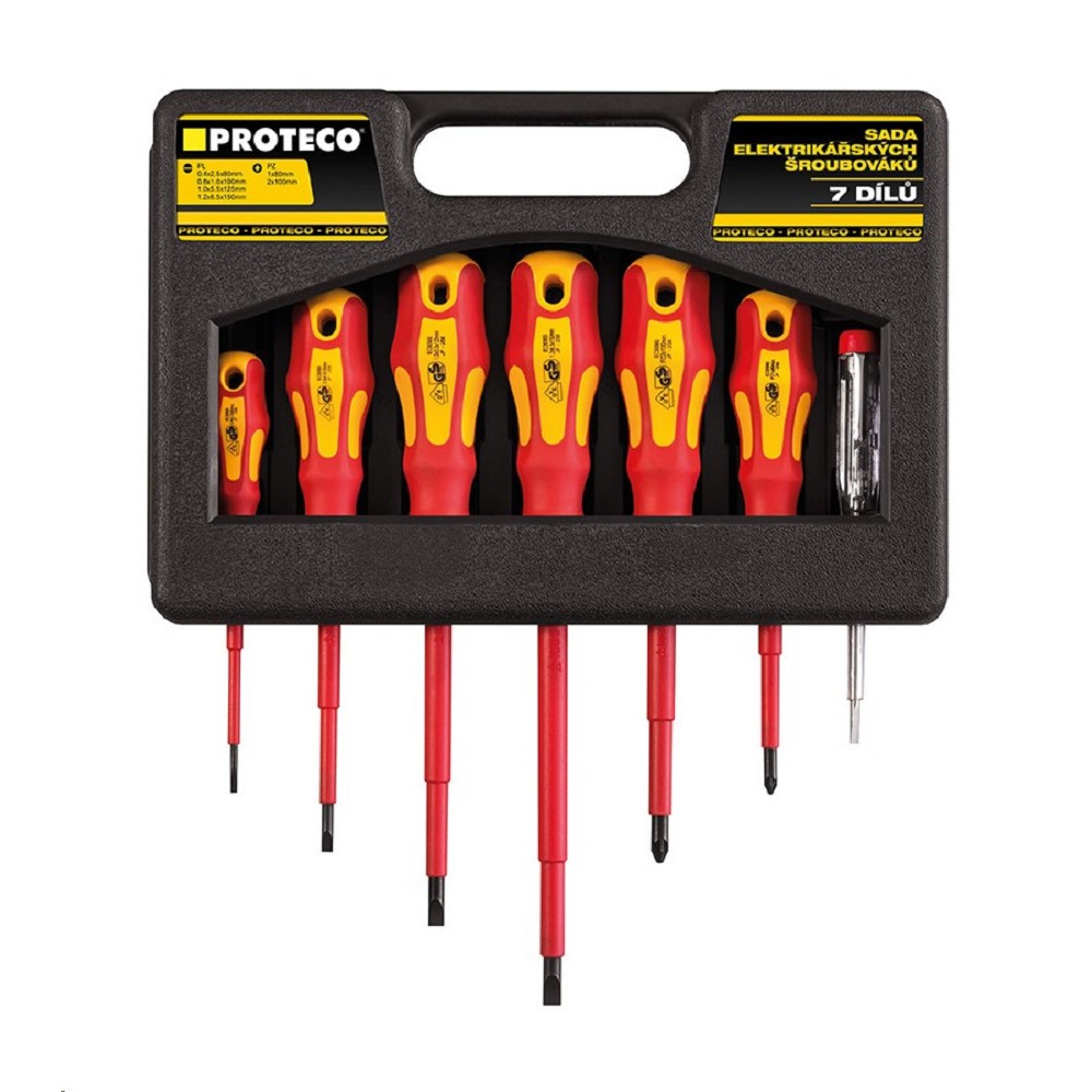 Sada šroubováků elektrikářských 7-dílná v kufru 10.07-990-04 Sada obsahuje: šroubovák plochý 2,5x80mm, 4x100mm, 5,5x125mm, 6,5x150mm šroubovák PZ1x80mm, PZ2x100mm zkoušečka s plochým hrotem 3x65mm Materiál: CrV, protiskluzové provedení