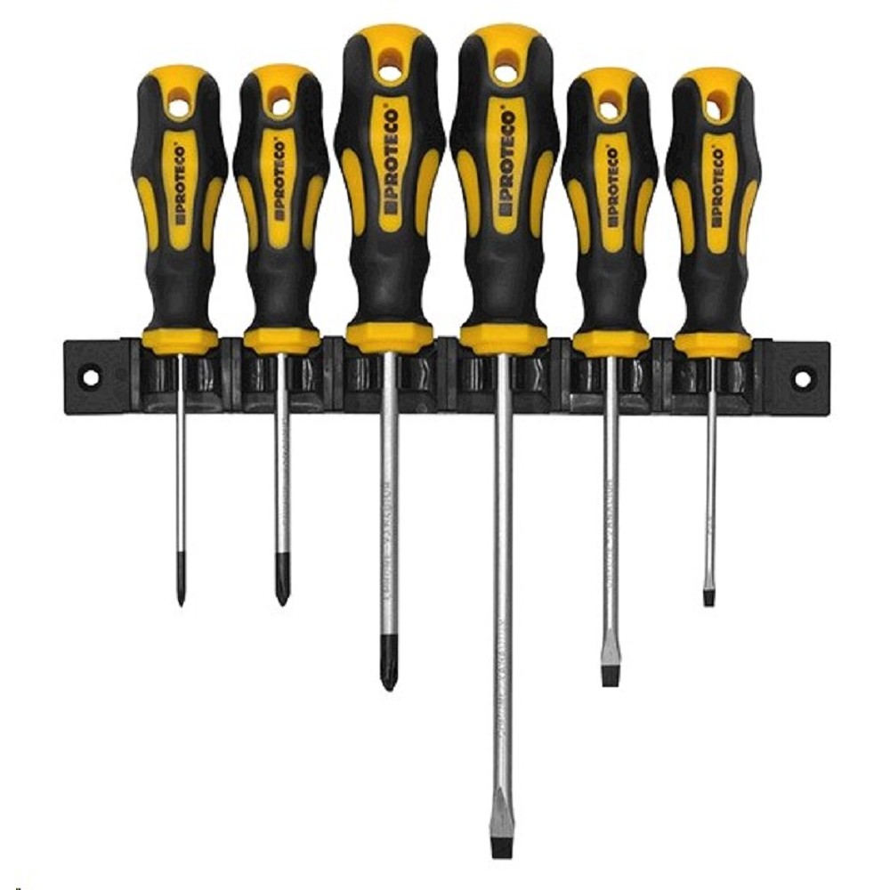 PROTECO sada šroubováků (PL + PH) 6-dílná v krabici 10.07-990-02 Sada plochých a křížových PH šroubováků. Šestidílná sada obsahuje tři ploché a tři křížové šroubováky z vysoce kvalitní chrom-vanadiové oceli. Komfortní úchop šroubováku zajistí plastové rukojeti s pryžovými prvky. Sada obsahuje: Šroubováky PL 0.6 x 3.5 - 75 mm; 1.0 x 5.5 - 100 mm; 1.2 x 6.5 - 150 mm Šroubováky PH 0 - 75 mm; 1 - 75 mm; 2 - 100 mm