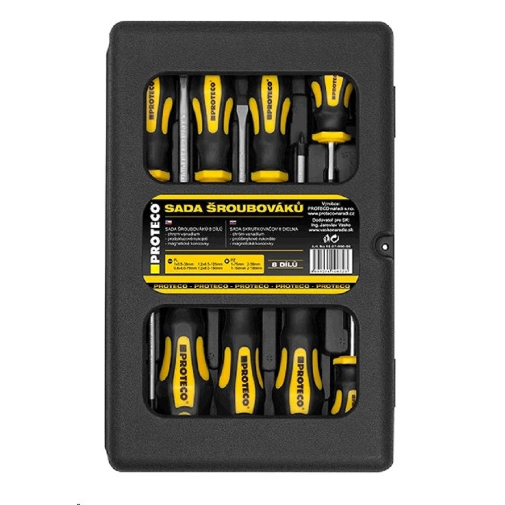 Sada šroubováků PL+PZ 8-dílná v kufru PROTECO 10.07-990-06 Sada šroubováků PL+PZ 8-dílná v kufru PROTECO 10.07-990-06 je praktická a komplexní sada nářadí, která by neměla chybět žádnému kutilovi ani profesionálovi. Tato sada obsahuje osm šroubováků s různými typy a velikostmi hrotů, což umožňuje široké využití pro různé druhy šroubů. Vlastnosti: Počet dílů: 8 Typ hrotů: Plochý (PL) a křížový (PZ) Materiál hrotů: Kvalitní ocel Materiál rukojeti: Plast s protiskluzovou úpravou Balení: Praktický kufřík pro snadné skladování a přenášení Kód produktu: 10.07-990-06 Značka: PROTECO Obsah sady: Sada obsahuje šroubováky s plochými a křížovými hroty různých velikostí, což umožňuje utahování a povolování široké škály šroubů. Konkrétní složení sady se může lišit, proto je ideální zkontrolovat popis produktu u prodejce. Výhody: Komplexní sada: Sada obsahuje nejčastěji používané typy a velikosti šroubováků. Kvalitní materiály: Šroubováky jsou vyrobeny z kvalitní oceli, což zajišťuje jejich dlouhou životnost. Ergonomické rukojeti: Rukojeti šroubováků jsou navrženy tak, aby poskytovaly pohodlné a bezpečné uchopení. Praktický kufřík: Kufřík umožňuje snadné skladování a přenášení šroubováků. Široké využití: Sada je vhodná pro různé druhy prací, od domácích oprav až po profesionální použití. Použití: Sada šroubováků je určena pro utahování a povolování šroubů s plochou a křížovou hlavou. Je vhodná pro použití v domácnosti, dílně, na stavbě a v dalších oblastech, kde je potřeba pracovat se šrouby. Upozornění: Před použitím šroubováku se ujistěte, že je hrot správně nasazen na šroub. Nepoužívejte šroubovák k jiným účelům, než ke kterým je určen. Při práci s šroubovákem dbejte na bezpečnost a používejte ochranné pomůcky. Sada obsahuje: Šroubovák plochý: 0,8 x 4,0 - 75 mm; 1 x 5,5 - 38 mm; 1,2 x 6,5 - 125 mm; 1,2 x 8,0 - 150 mm Šroubovák křížový PZ: 1 - 75 mm; 1 - 150 mm; 2 - 38 mm; 2 - 100 mm