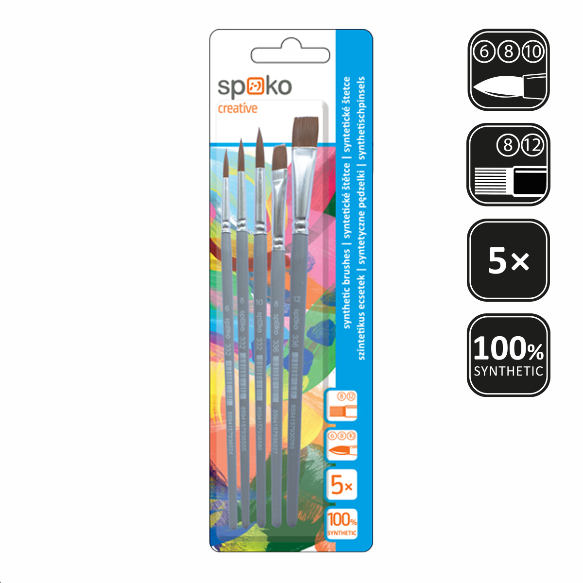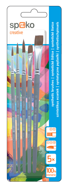 Praktická sada kvalitních štětců s jemným syntetickým pružným vlasem, který usnadňuje roztírání barev a výborně drží tvar. Štětce vynikají dlouhou životností - neztrácí vlákna a jsou odolnější vůči poškození ředidly. Snadná údržba, neabsorbují pigment a mastnotu. Vhodné pro školáky a volnočasové tvoření. Dřevěná šedá lakovaná násadka. mix druhů: ploché vel. 8, 12, kulaté vel. 6, 8, 10 pro práci s akvarelovými a vodovými barvami, temperami, akrylovými barvami, lepidly a laky ideální pro alergiky výhodné balení Zakupte produkt Sada syntetických štětců Spoko, 5 ks - pl. 8,12, kul. 6,8,10 z kategorie Výtvarné potřeby | Štětce | Sady od výrobce Spoko za cenu 104 Kč.