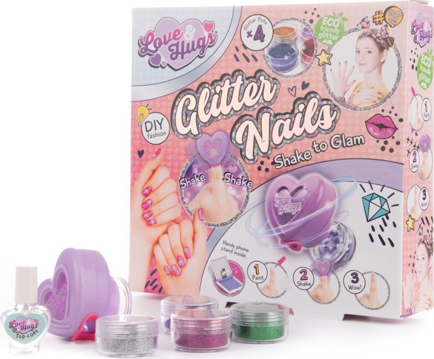 Sada třpytivé nehty Love and Hugs – nalakujte nehty bezbarvým lakem a použijte třpytky. Balení obsahuje 4 kelímky s ekologickými třpytkami, bezbarvý lak na nehty, prstýnek, šejkr a praktický stojánek na mobilný telefon.