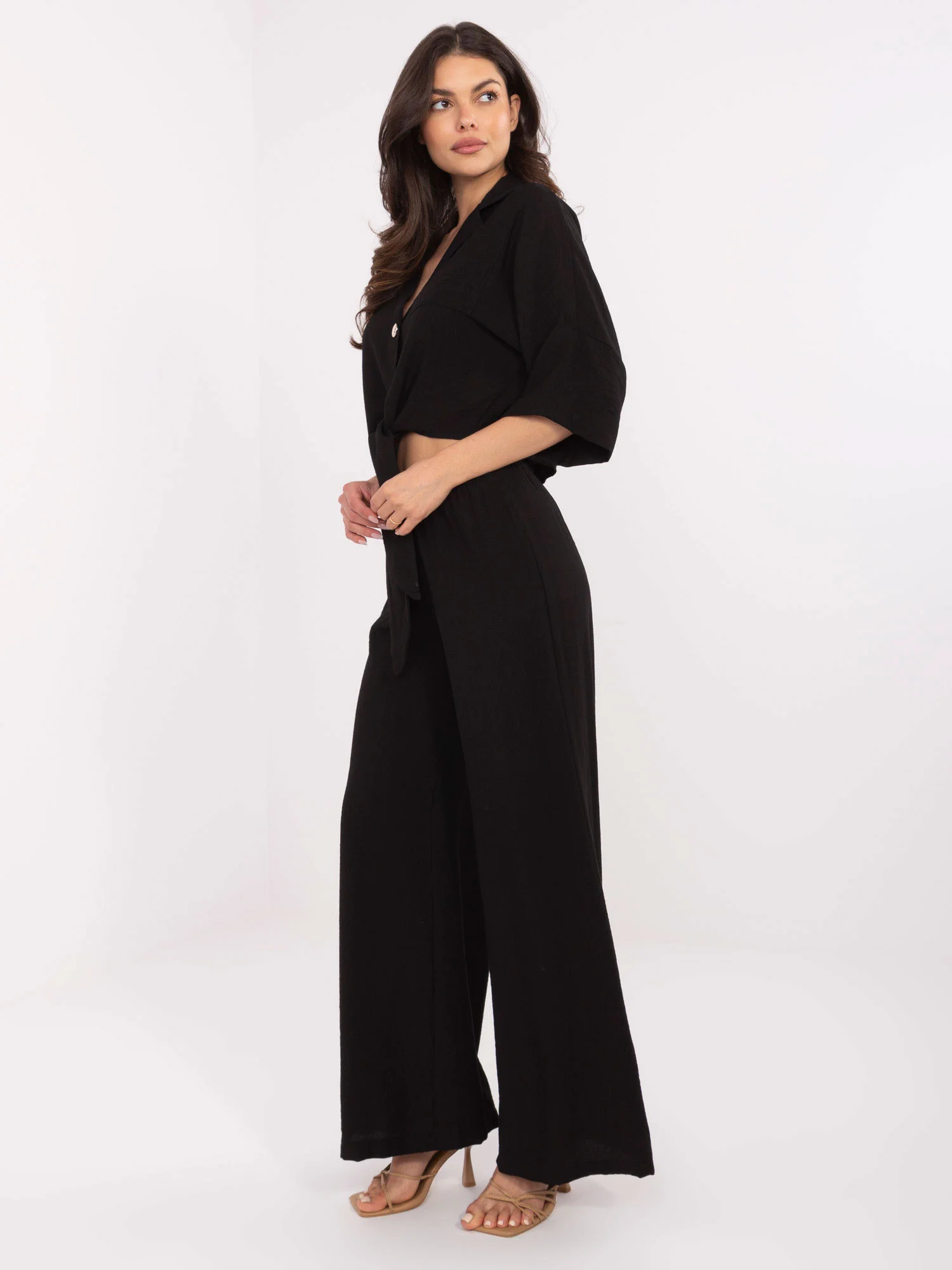 Modelka má na sobě velikost S. Rozměry modelky: výška 173 cm, prsa 89 cm, pas 65 cm, boky 91 cm. Rozměry trička ve velikosti S. měřeno na plocho: šířka v podpaží - 58 cm, šířka v bocích - 47 cm, délka rukávu - 48 cm, celková délka - 47 cm. Rozměry kalhot ve velikosti S. Šířka v pase - 32 cm (na plocho), šířka v pase - 46 cm (při natažení), výška v pase - 29 cm, šířka v bocích - 50 cm, celková délka - 104 cm.Velikost alt.VýškaObvod hrudníkuVnější délka rukávůVnější délka rukávuS36160-164825949M38162-172866151L40164-174916353XL42166-178966555