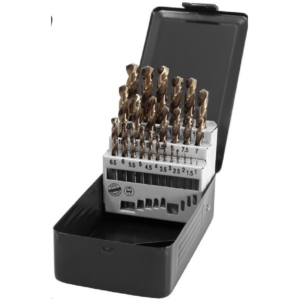 Sada vrtáků do kovu 25 dílů 1.5 - 13 mm HSS-Co5 cobaltové 45.04-2907-25 PROTECO sada vrtáků do kovu HSS-Co5 cobaltových 25ks je sadou vrtáků s válcovou stopkou o těchto rozměrech: 1; 1,5; 2; 2,5; 3; 3,5; 4; 4,5; 5; 5,5; 6; 6,5; 7; 7,5; 8; 8,5; 9; 9,5; 10; 10,5; 11; 11,5; 12; 12,5 a 13 mm. Slouží k vrtání otvorů do kovu, zejména pak železa, oceli, šedé litiny a hliníkových slitin, mosazi, bronzu a mnoha dalšího. Vrtáky jsou vyrobany z kvalitní rychlořezné oceli. Tvar vrtáku a přesné křížové broušení, umožňuje přesné nasazení při vrtání, zvyšuje přesnost vystředěného běhu a zkracuje dobu potřebnou k vrtání. Nejpoužívanější rozměry široký rozsah využití kvalitní rychlořezná ocel vysoká odolnost proti lomu praktický kovový pořadač