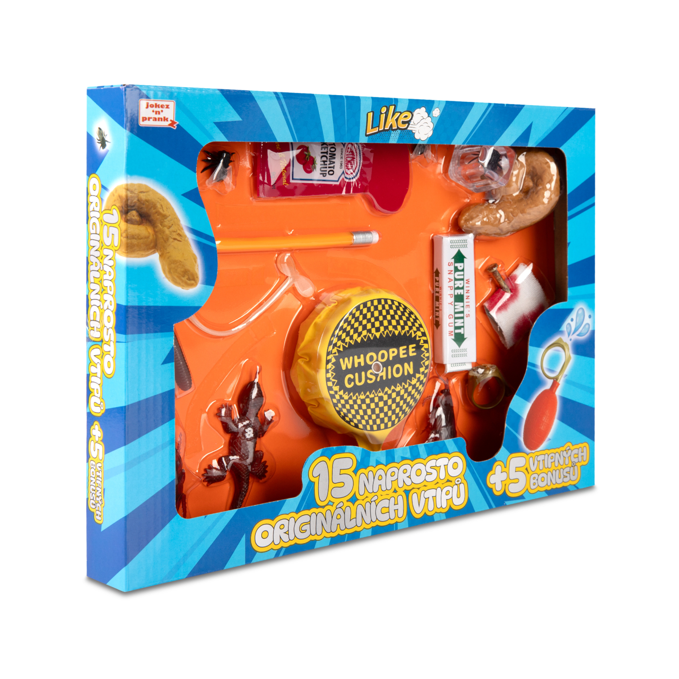 Sada 15 vtipů + 5 bonusových – spousta bláznivých vtípků a návod na dalších 5 zábavných žertíků! Balení obsahuje: 15 vtipů (1× prdící pytlík, 1× ohýbací tužka, 1× nudle svítící ve tmě, 1× houpací žížala, 1× stříkací prstýnek, 1× hřebík skrz prst, 1× hovínko, 1× brouk v ledu, 2× švábi, 2× mouchy, 1× ještěrka, 1× žvýkačka pastička a 1× rozlitý kečup) + návod na dalších 5 vtipů