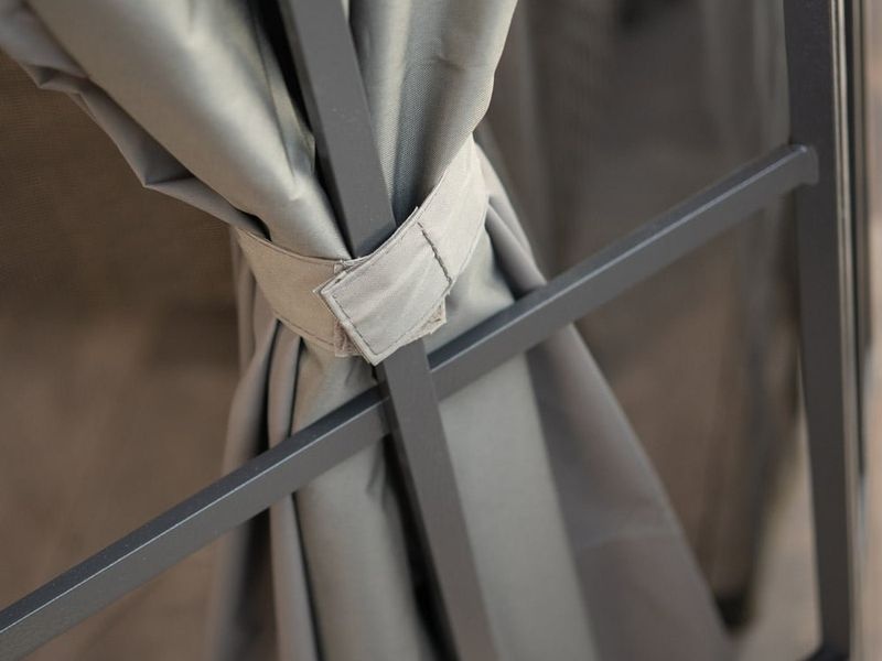 Sada závěsů k altánu Savino 1214, které vám v létě poskytnou stín i soukromí. Barva: tmavě šedá