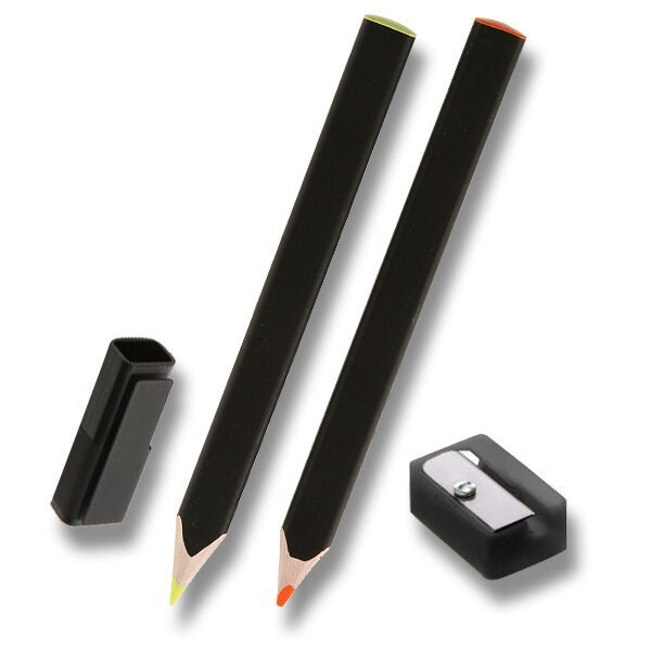 Sada dvou zvýrazňovacích pastelek, uzávěru a ořezávátka. Balení obsahuje 24 samolepek.moderní hranatý tvar se zaoblenými rohyvyrobené z lipového dřevamají svítivě žlutou a oranžovou tuhu