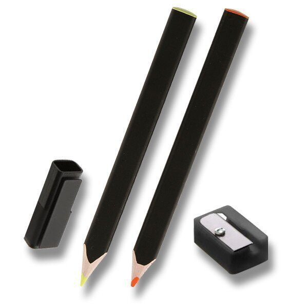 Sada dvou zvýrazňovacích pastelek, uzávěru a ořezávátka. Balení obsahuje 24 samolepek. moderní hranatý tvar se zaoblenými rohy vyrobené z lipového dřeva mají svítivě žlutou a oranžovou tuhu