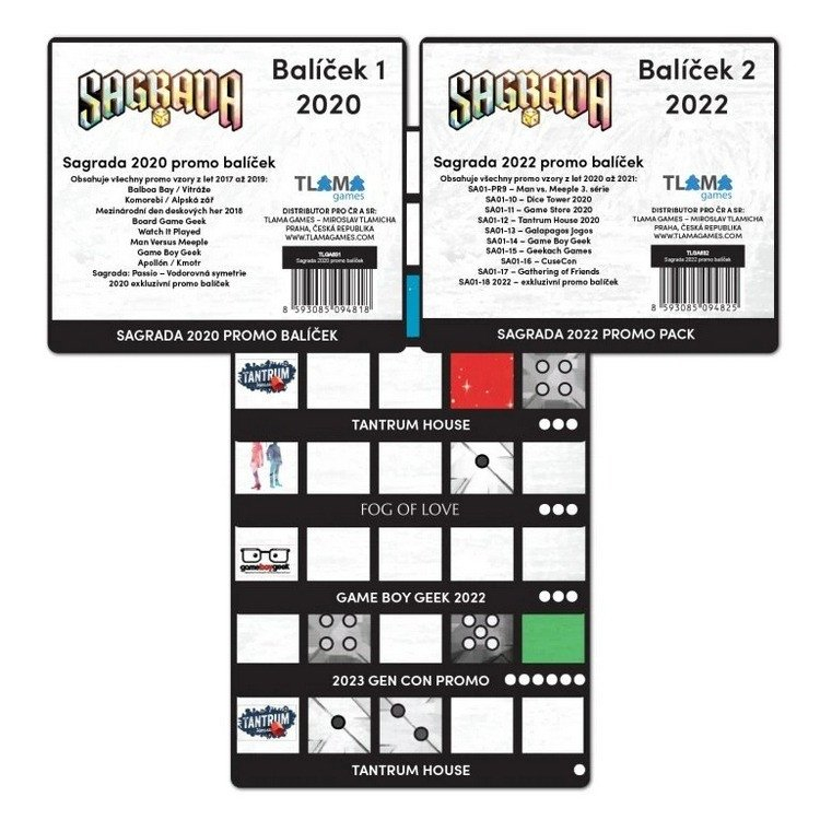 Doplňte svou sbírku o všechny Sagrada promo karty vydané až do vydání remasterované edice v roce 2026! Tento balíček obsahuje 29 promo karet vitráží, které byly k dispozici pouze na festivalech, na kanálech některých recenzentů nebo byly součástí balení jiné hry. Dále je tu jedna karta vydaná výhradně v Polsku a dvě, které najdete jen v tomto balíčku!Karty jsou kompatibilní také s původním vydáním hry Sagrada. Počet hráčů: 1-4Herní doba: 30 min Balení obsahuje: 29 karet vzorů vitráží