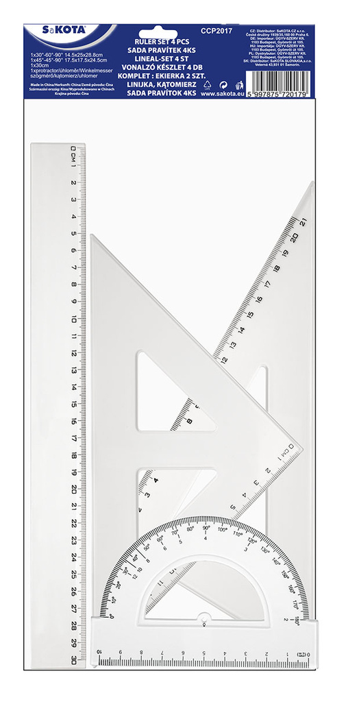 Kvalitní pravítka s přesnou ryskou, ocení všichni studenti. Balení obsahuje 4 ks plastových pravítek: - pravoúhlý trojúhelník o délce 16 cm s ryskou- rovné pravítko o délce 30 cm- trojúhelník 90°/30°/60°- úhloměr Dodáváno v plastové kapse.
