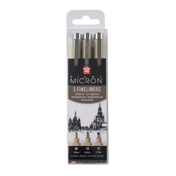 Výběr 3 černých per Pigma Micron s nejširší šířkou hrotu z tohoto sortimentu: 1 x 08 (0,50 mm), 1 x 10 (0,60 mm), 1 x 12 (0,70 mm). Pera Pigma Micron jsou voděodolné a permanentní popisovače, které věrně používají designéři, vědci, archiváři, manga umělci, karikaturisté, ilustrátoři a hobbyisté. Je to doporučené pero pro Zentangle. Díky jemnému hrotu je toto pero ideální pro tvorbu technických i uměleckých kreseb. Unikátní inkoust Sakura Pigma™ neprosvítá papírem, je permanentní, voděodolný, odolný proti vyblednutí, rychleschnoucí a pH neutrální.