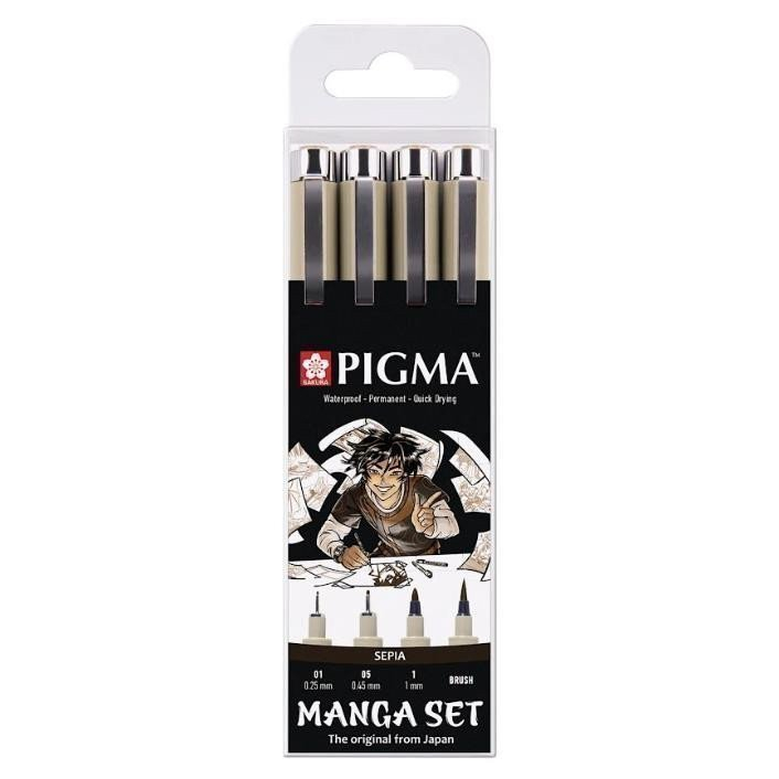 Sada nástrojů Manga se 2 pery Pigma Micron sepia (č. 01 a 05), 1 perem Pigma Graphic sepia (č. 1.0) a 1 štětcem Pigma Brush sepia. Staňte se skutečným Manga-profesionálem s touto speciální sadou Manga s vybranými pery ze série Pigma v sépiové barvě! Sakura Pigma Color Technologies; Pigma byla první tuší na světě, která kombinovala pigmenty a vodu. Díky jemnému hrotu je toto pero ideální pro tvorbu technických i uměleckých kreseb. Inkoust neprosvítá přes papír.
