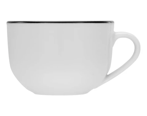 Hrnek o objemu 200 ml z bílého porcelánu s černým okrajem je vhodný na kávu a čaj. Díky univerzálnímu designu se hodí do jakékoli kuchyně.