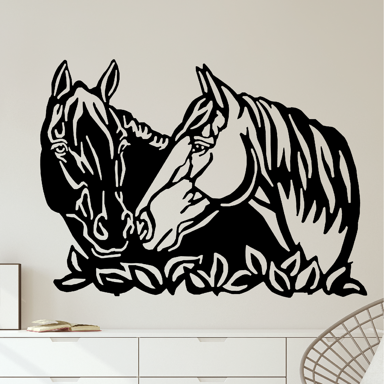Tato originální černá samolepící dekorace na zeď Koňské hlavy je ideální volbou pro všechny milovníky těchto ušlechtilých zvířat a bude se perfektně vyjímat v každé místnosti. Když člověk objeví lásku ke koním, zůstane mu navždy uložená až na samotném dně srdce.