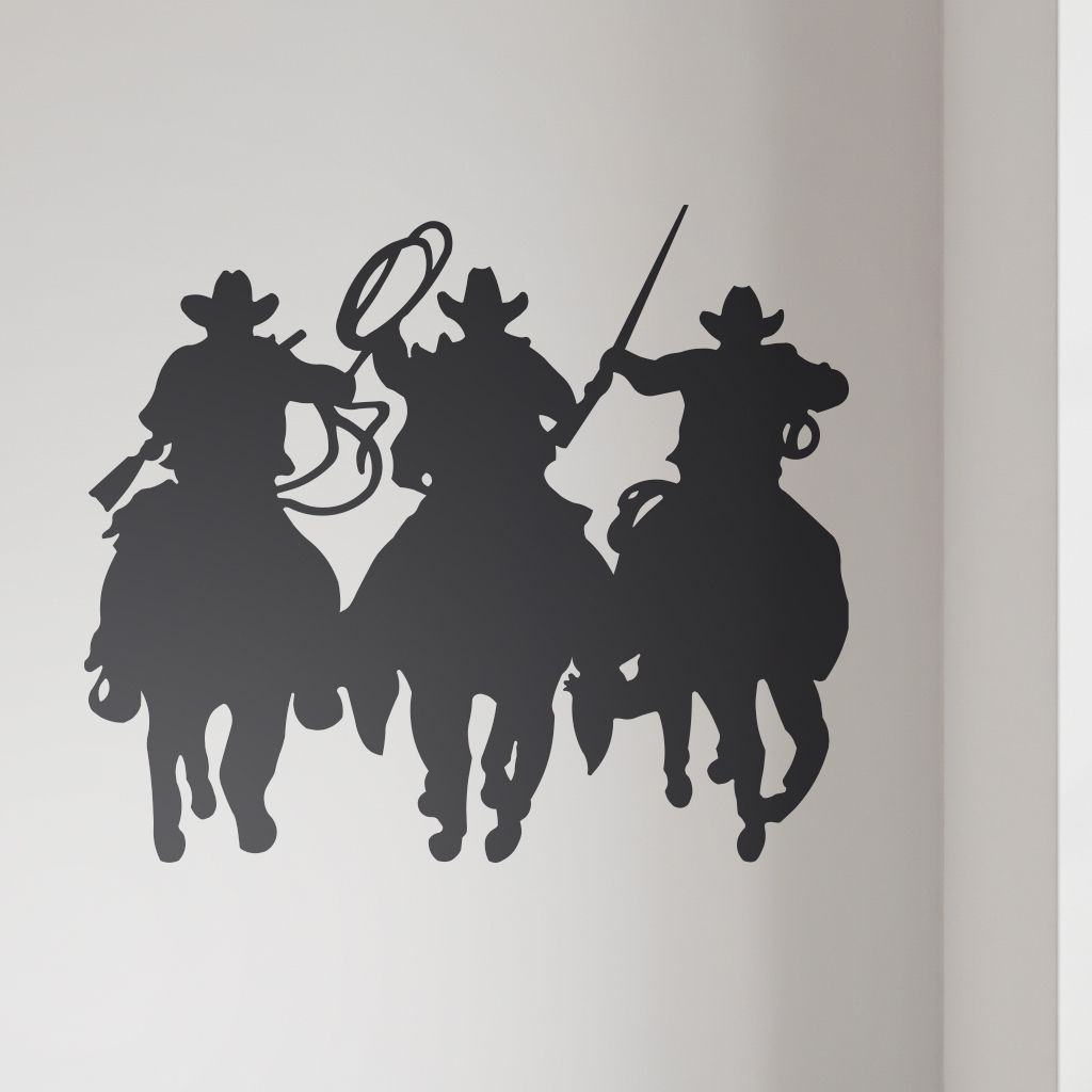 Tato originální černá samolepící dekorace na zeď Kovbojové není určena pouze pro fanoušky westernu. Skvěle se hodí třeba do obývacího pokoje, pracovny nebo na stěnu klučičího dětského pokoje. Klobouk, laso, vítr ve vlasech, slunce v zádech a pohled na svět z koňského sedla... Co víc by si mohl kovboj přát?! No přece naši dekoraci!