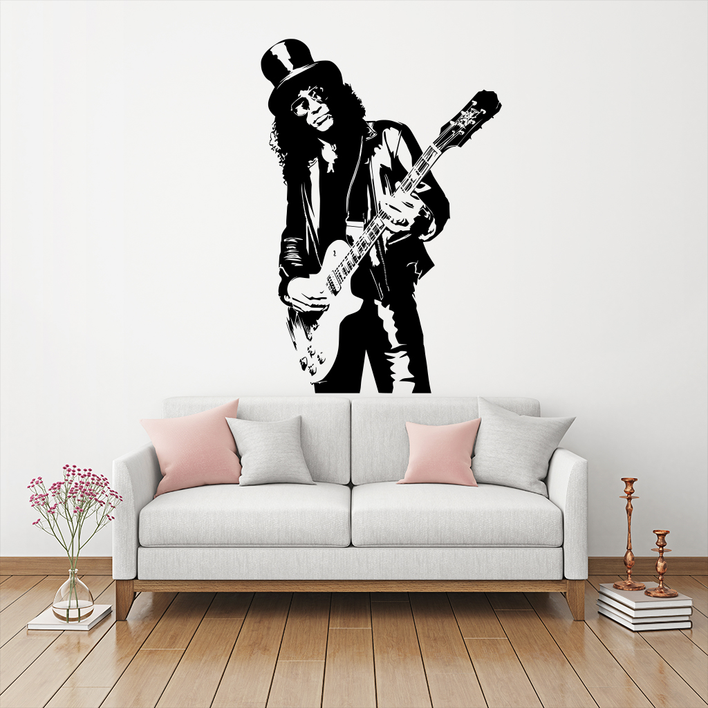 Tato originální samolepící dekorace na zeď Slash je ideální pro milovníky hudby. Tato samolepka zobrazuje siluetu slavného britsko-amerického hudebníka a skladatele Slashe, který je známý především jako sólový kytarista americké rockové skupiny Guns N' Roses, který dosáhl velkého světového úspěchu na konci 80. a začátkem 90. let.