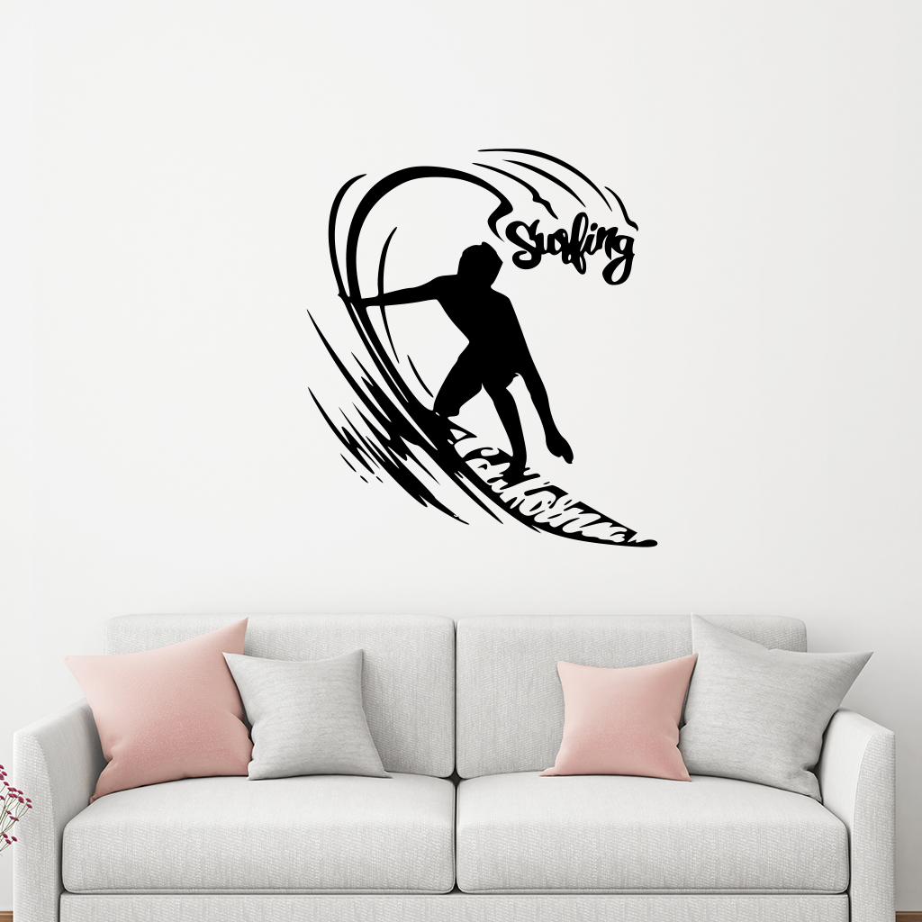 Tato originální samolepící dekorace na zeď Surfování se bude krásně vyjímat například v obývacím pokoji nebo pracovně. Surfing je vodní olympijský sport, který se skládá z jízdy na surfu, unášeného na nezlomené mořské vlně. Tato samolepka je ideálním způsobem, jak vyjádřit svou vášeň pro tento adrenalinový sport.