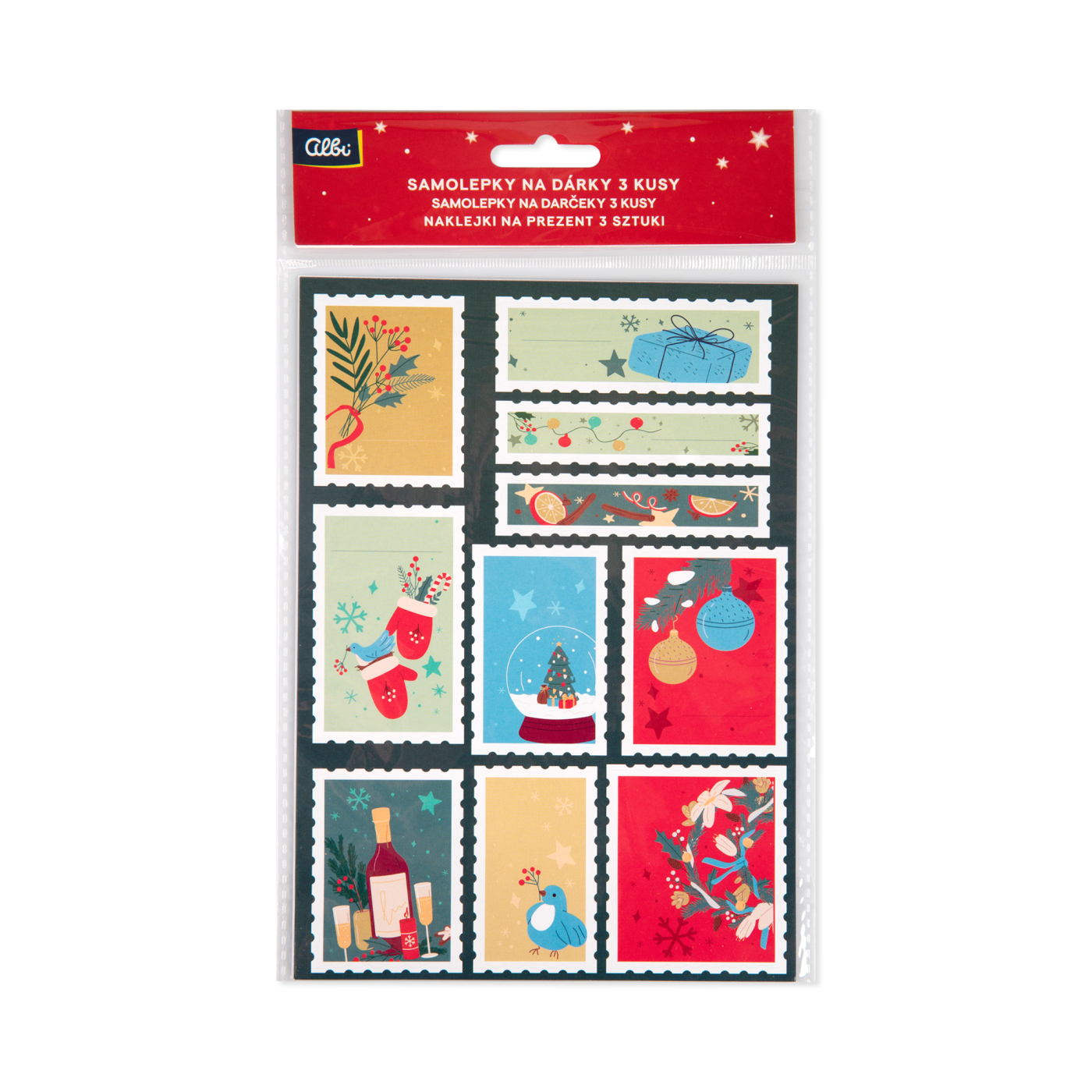 Sada 3 archů samolepek na dárky ve tvaru poštovních známek, které poslouží jako jmenovky či ozdoby. Rozměry archů: 14,8 × 21 cm