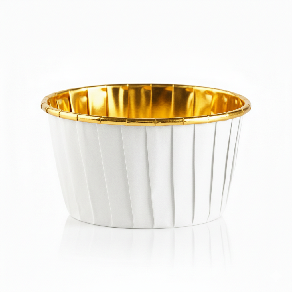 Samonosné košíčky bílo-zlaté (50 ks) jsou praktické a elegantní formičky na pečení muffinů, cupcaků i slaných dobrot. Díky pevné konstrukci drží tvar samy o sobě, takže je můžete používat i bez plechu na muffiny – ideální pro domácí pečení i profesionální cukrářské provozy. Košíčky jsou vyrobené z odolného teplu vzdorného hliníku, který zajišťuje rovnoměrné propečení těsta a stabilitu při manipulaci. Hotové muffiny se snadno vyjímají a košíčky zároveň vypadají luxusně i při přímém servírování. Výhody: samonosné – drží tvar i bez plechu vhodné na muffiny, cupcakes i slané pečení tepluodolný hliník pro rovnoměrné propečení elegantní bílo-zlatý vzhled pro prezentaci ideální pro domácí i profesionální použití Balení: 50 ks Rozměr: 5 × 3,9 cm