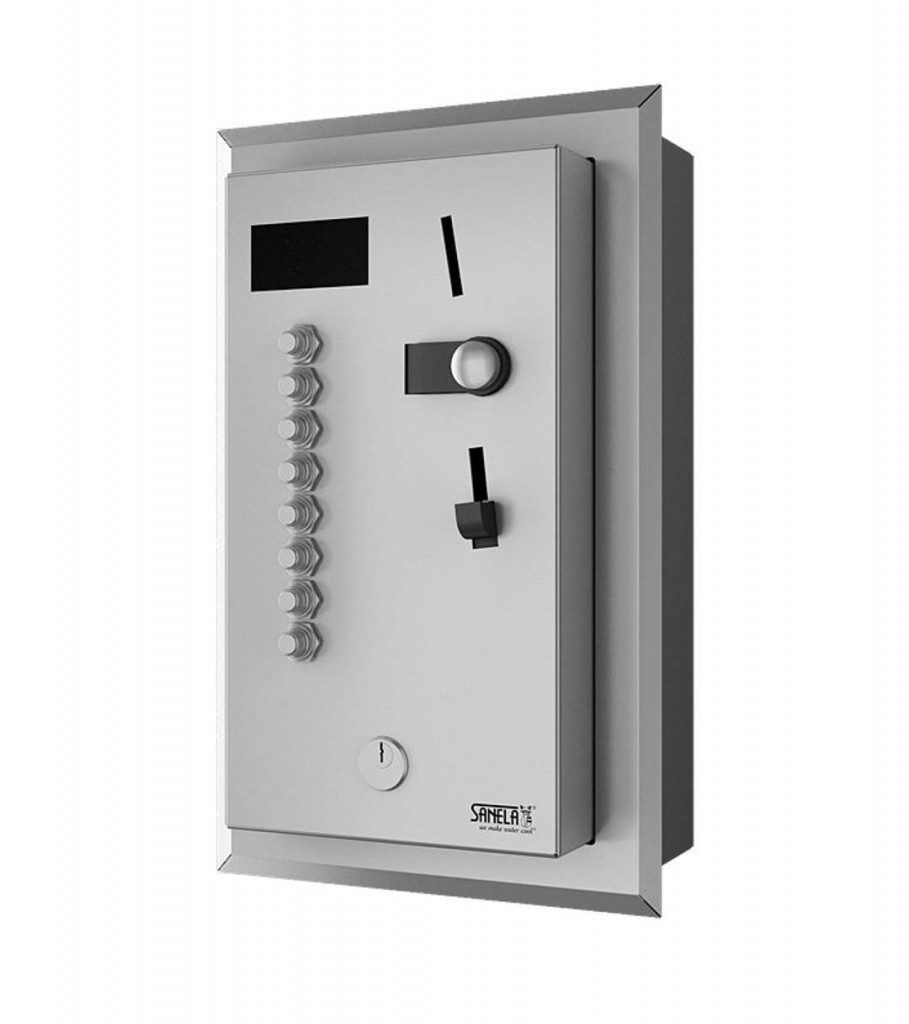 Vestavný mincovní automat pro 4-8 sprch, interaktivní ovládání hygienický proplach antivandalové provedení uzamykatelný možnost získání statistických informací, diagnostika zařízení materiál: nerezová ocel AISI 304 povrchová úprava: matná nerez nastavení parametrů pomocí dálkového ovladače SLD 05 Nastavitelné parametry nastavení času sprchování dle hodnoty vhozené mince nebo žetonu nastavení délky sepnutí zpoždění možnost aktivace funkce automatického proplachu nastavení hodnoty času nastavení aktuálního kurzu eura nastavení hodnoty žetonu nastavení kontrastu displeje možnost vypnutí některé z napojených sprch Specifikace použití volba sprchy uživatelem před vhozením mince nebo žetonu si uživatel stiskem tlačítka zvolí požadovanou sprchu, zobrazí se číslo sprchy na displeji uživatel si může libovolně pouštět a zastavovat vodu přímo ve sprše 30 s před ukončením dodávky vody je uživatel upozorněn přerušením proudu vody automat mince sčítá, ale nevrací Technické údaje rozměry otvoru ve zdi: 335 x 200 x 125 mm napájecí napětí: 24 V DC příkon: až 65 W druhy mincí: 5, 10, 20 a 50 Kč, 1 a 2 EUR, kovový žeton nastavitelná doba zpoždění sepnutí 0-255 s (standardně 30 s) nastavitelný čas za zaplacených 5 Kč: 0-255 s (standardně 30 s) Obsah dodávky nerezový mincovní automat s elektronikou, mincovníkem a boxem na mince, sada klíčů (2 ks) montážní rám sada žetonů není součástí balení dálkové ovládání a napájecí zdroj není součástí dodávky