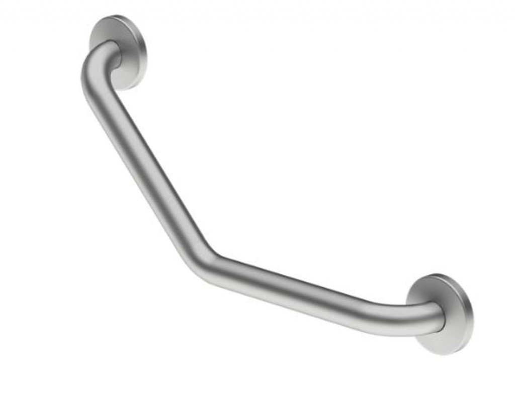 Nerezové madlo lomené provedení: matný nerez rozměry: 470 x 190 x 73 mm průměr tyče 32 mm krycí rozety Ø 80 mm lomené provedení - úhel 135° sada pro uchycení instalace vrtáním pro osoby se sníženou pohyblivostí