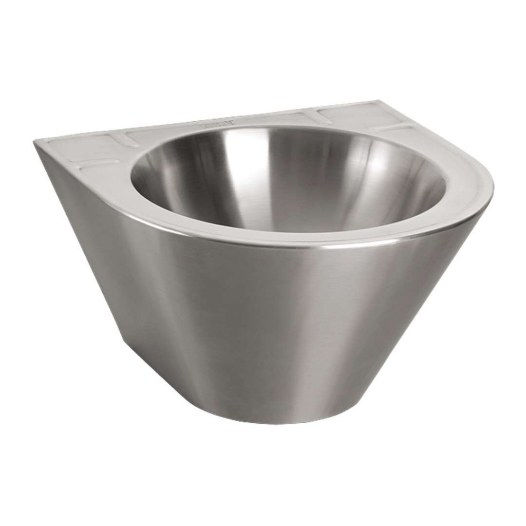 Nerezové kónické závěsné umyvadlo bez přepadu, průměr 355 mm Vlastnosti rozměr 500x495 mm průměr 355 mm antivandalové provedení použití pro věznice, veřejný sektor montáž přes servisní otvor a speciální šrouby bez otvoru pro baterii vyztuženo polyuretanem (snížená hlučnost, zvýšená pevnost) materiál AISI - 304 povrch matný nerez Součástí balení nerezové umyvadlo sifon úchytová sada