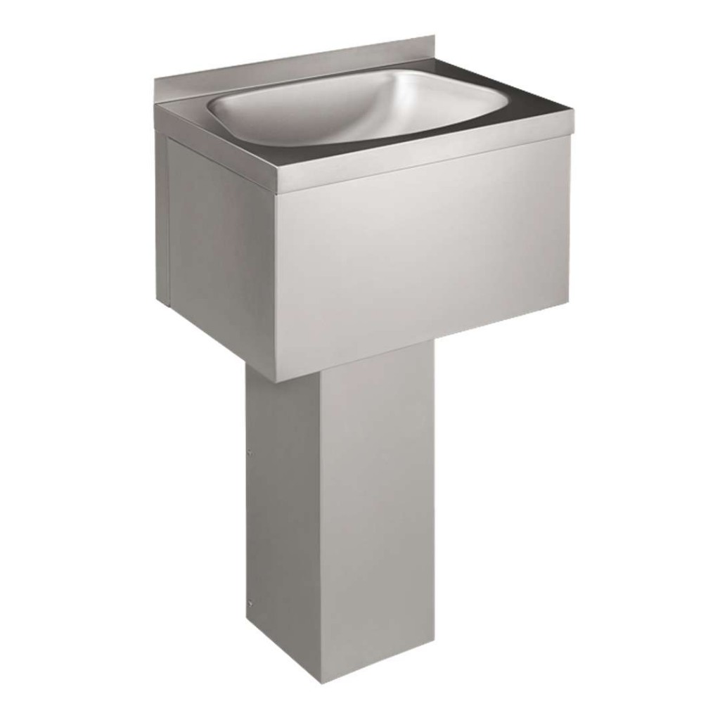 Samonosné nerezové umyvadlo SLUN 57 s opláštěním ke stěně, bez přepadu rozměry: 500 x 330 x 850 mm bez otvoru pro umyvadlovou baterii materiál: nerezová ocel AISI 304 povrch matný obsahuje sifon ukotvení do podlahy, včetně sady pro uchycení