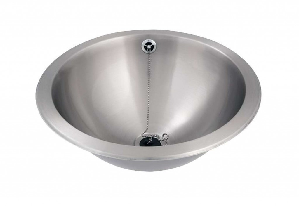 Nerezové umyvadlo SLUN 34, s přepadem rozměry: Ø 455 mm bez otvoru pro umyvadlovou baterii materiál: materiál CrNi 18/10 (AISI 304) povrch matný instalace: zapuštěním do desky shora sifon, přepadová sada montáž lepením