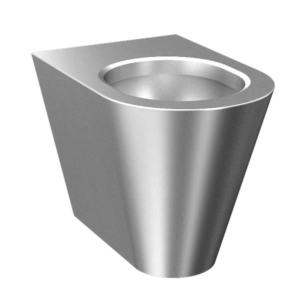 Nerezový stojící klozet SLWN 05 antivandalové provedení použití pro věznice na podlaze stojící WC k uchycení na stěnu vyztužené polyuretanem (snížená hlučnost, zvýšená pevnost) montáž přes závitové tyče (M10, délka 190 mm), z druhé strany stěny materiál: nerezová ocel AISI 304 povrch matný