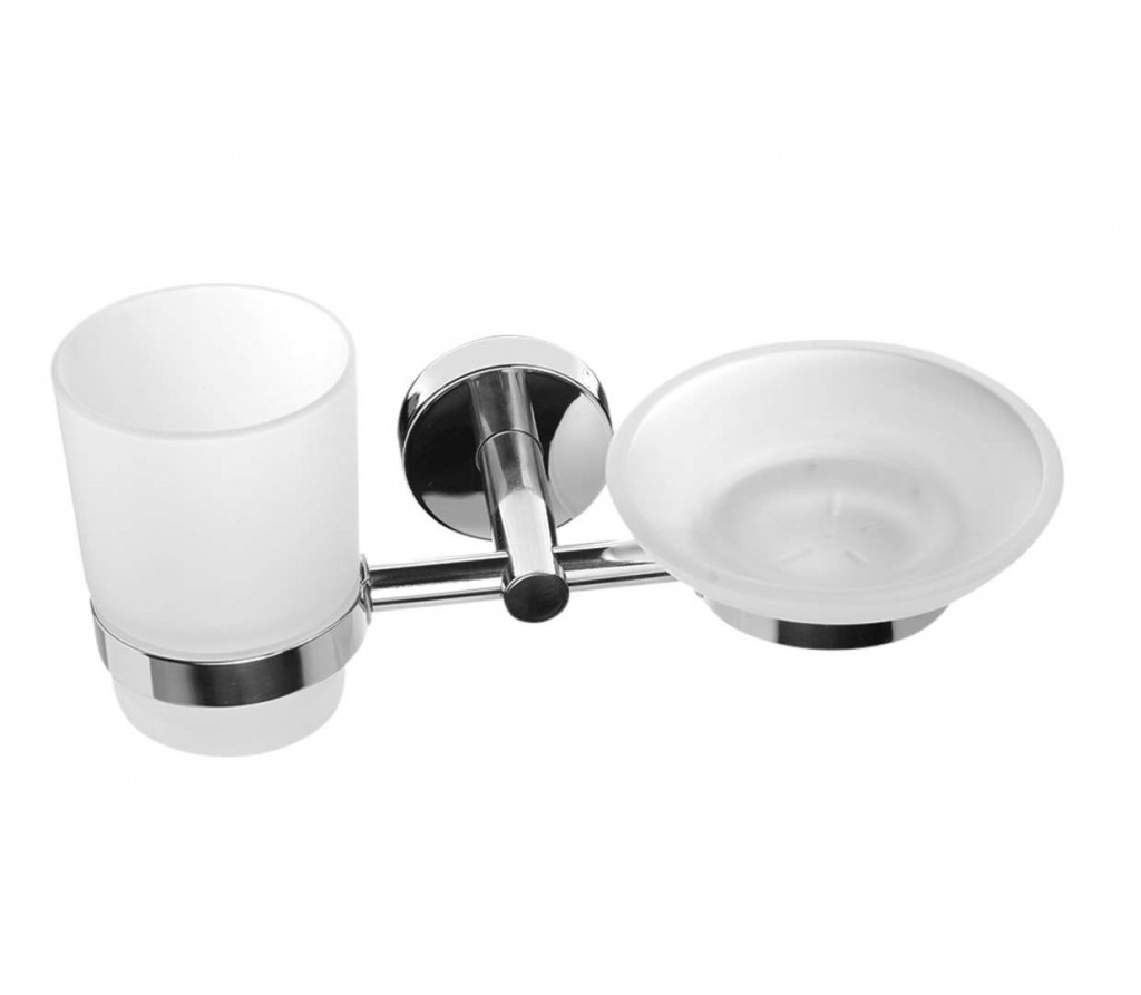 Sklenička na ústní hygienu s mýdlenkou a dvojitým držákem materiál: matné sklo/nerezová ocel povrch: lesklá nerez rozměry: 220 x 120 x 120 mm instalace pomocí oboustranné lepící pásky 3M VHB pro dokonalou fixaci, nebo vrtáním na zeď včetně sady pro uchycení, lepící páska 3M