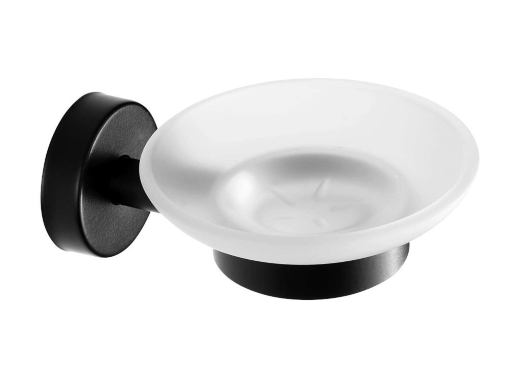 Mýdlenka s nástěnným držákem materiál: matné sklo/nerezová ocel povrch: matná černá rozměry: 140 x 110 x 60 mm instalace pomocí oboustranné lepící pásky 3M VHB pro dokonalou fixaci, nebo vrtáním na zeď včetně sady pro uchycení, lepící páska 3M