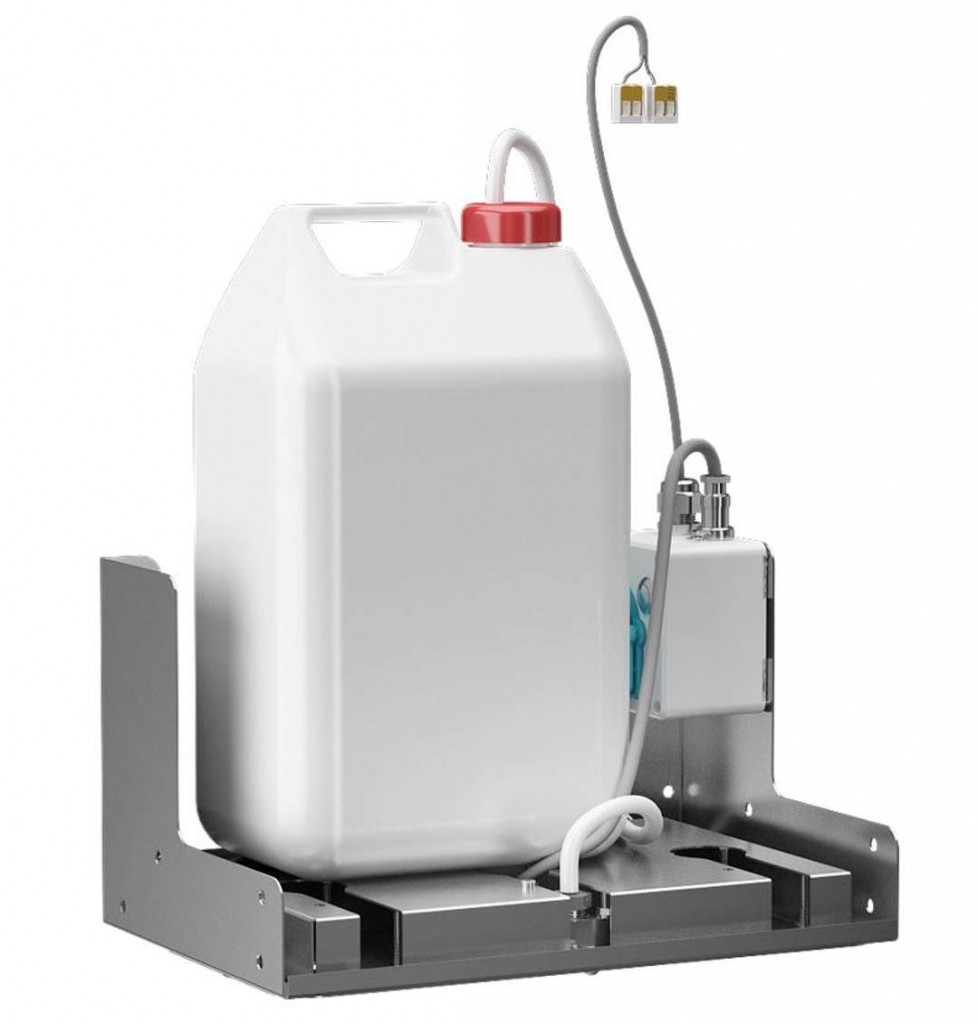 Nástěnný dávkovač mýdla pro umístění za zrcadlo nástěnný dávkovač mýdla pro umístění za zrcadlo plastová vnitřní nádobka ABS montáž na stěnu za zrcadlo jednoduché doplňování mýdla nízká spotřeba mýdla reaguje na přítomnost rukou ve snímané zóně pod zrcadlem spuštěním jedné dávky mýdla (čas dávkování mýdla možno nastavit v rozsahu 1,3 - 13 s), standardně 2,6 s použití ve veřejném sektoru, určeno pro kanystr 5 l nastavení parametrů pomocí dálkového ovladače SLD 03 materiál nerezová ocel AISI 304 (1.4301) Technické údaje rozměry: 330 x 200 x 300 mm hmotnost: 1,6 kg tloušťka nerezového materiálu: 1 mm objem: 5 l napájecí napětí: 24 V DC dosah: 0,14 - 0,2 m doporučená viskozita mýdla: 10 Pa*s - 5000 mPa*s (nepoužívat chemická rozpouštědla ani dezinfekce) Specifikace dodávky nerezový montážní držák s dávkovačem mýdla a elektronikou přívodní hadičky čerpadlo na mýdlo kanystr 5 l