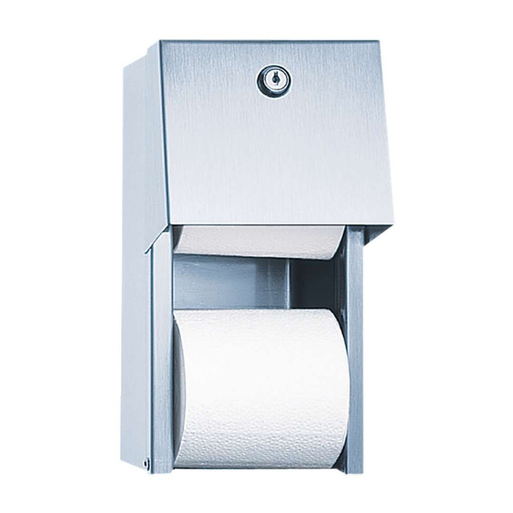 nerezový držák toaletních rolí k montáži na stěnu, pro dvě běžné WC papírové role (D = do 135 mm), po použití první role je automaticky doplněna druhá, se zámkem a klíčem, povrch matný