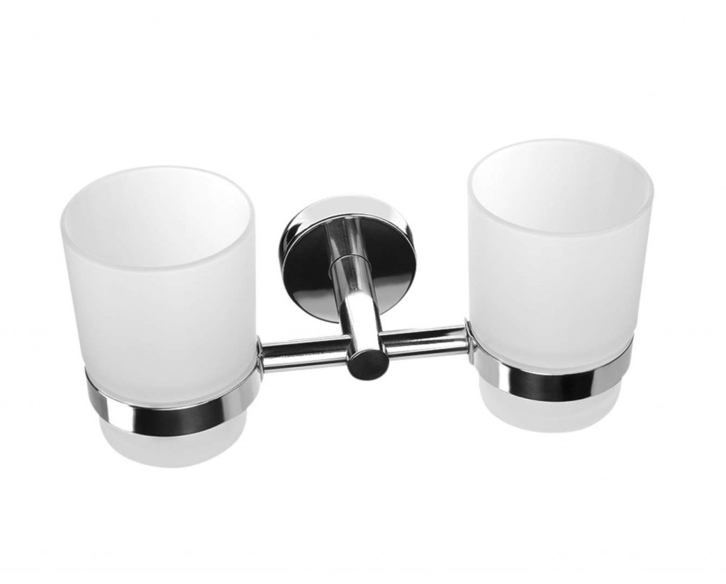 Skleničky na ústní hygienu s dvojitým držákem materiál: matné sklo/nerezová ocel povrch: lesklá nerez rozměry: 210 x 100 x 100 mm instalace pomocí oboustranné lepící pásky 3M VHB pro dokonalou fixaci, nebo vrtáním na zeď včetně sady pro uchycení, lepící páska 3M